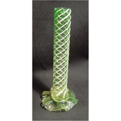 This English stick vase was most likely made by the Stevens & Williams Company. It stands 8 3/4" tall. The base is 3 1/2". It was hand blown and then a specic machine or tool was used to apply the white spiraling clockwise overlay glass. It is uniformly placed on. The vase is vaseline glass. It does react to blacklight as you can see in one of my photos. There is no damage to this piece.