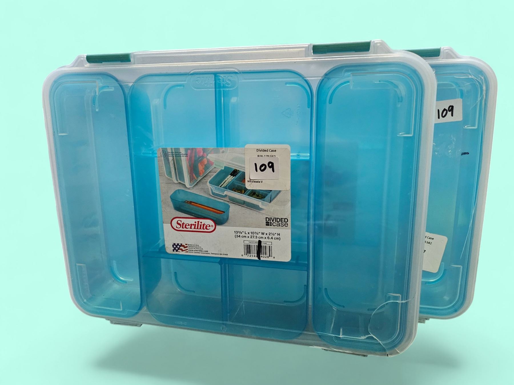 two pack sterilite divided storage cases 13 and 3/8 in Long by 10 3/4 in wide by 2 1/2