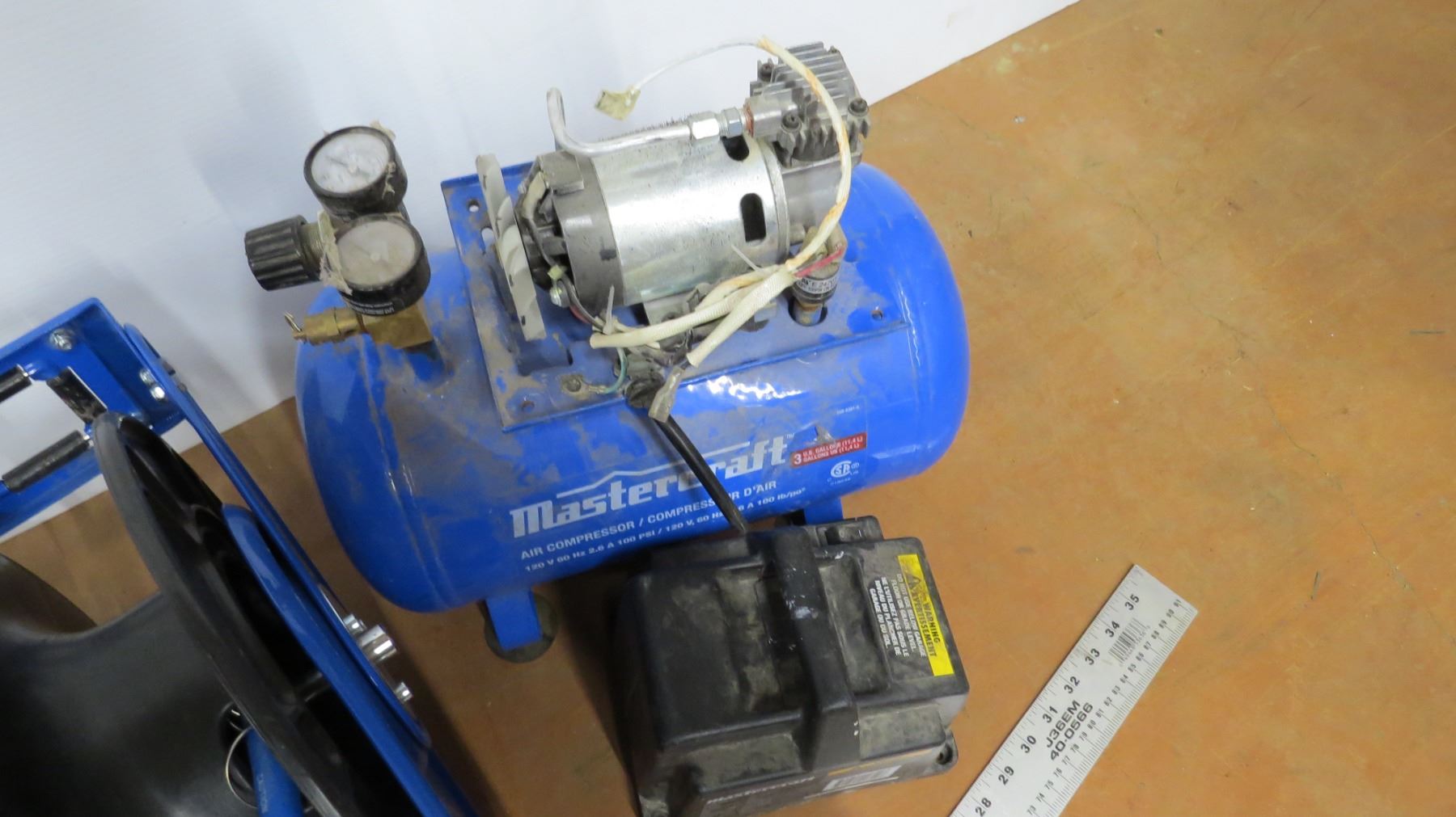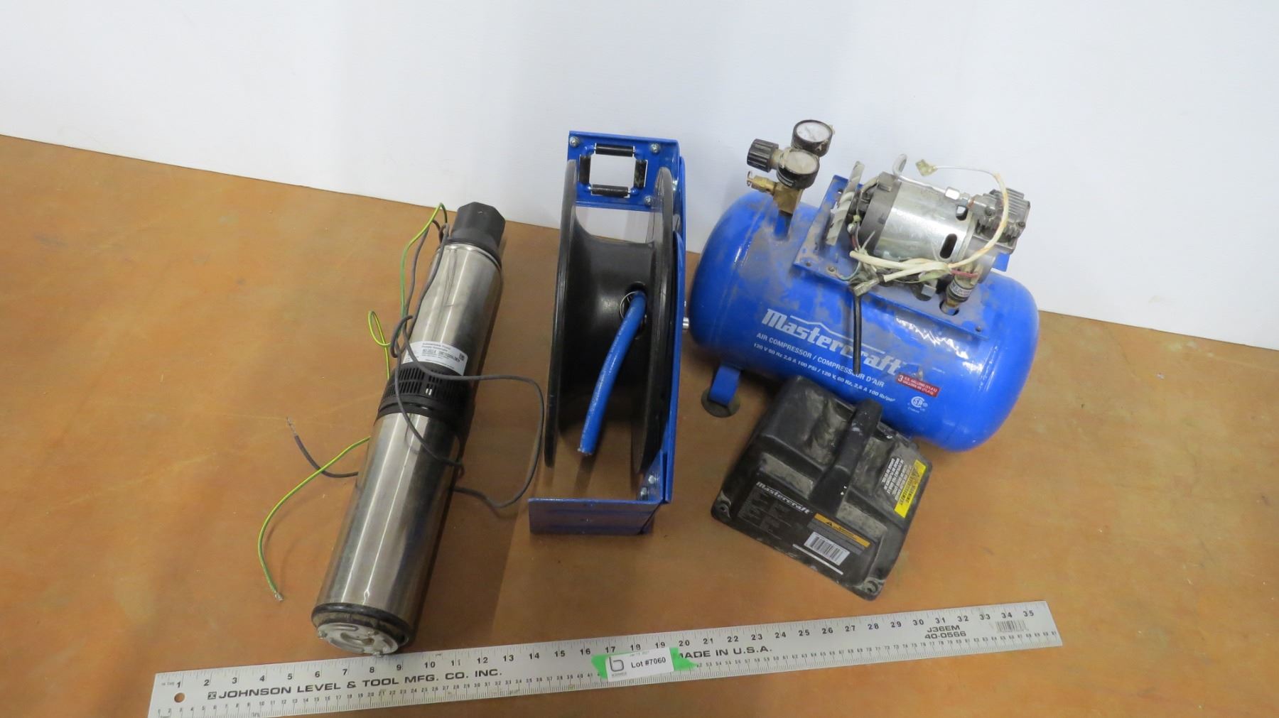 submersible pump, hose reel (no hose), mastercraft air compressor (cord cut)