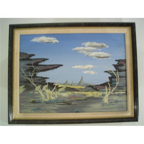 American School (20th.c) Unsigned surreal painting of a desolate landscape. Acrylic on canvas & in excellent condition. 19"x26". Framed.