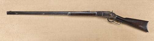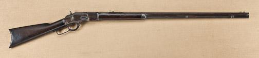 tWinchester model 1873 lever action rifle, factory special order 34” octagon barrel, full magazine with two barrel bands, set trigger, rifle butt, serial #198633B. The rifle shows a brown patina finish with traces of blue mixed in, some scattered light to moderate pinprick pitting mixed in and just normal aging, the barrel address, model marking, and caliber markings are good. The stock shows some normal losses, wear and darkening, and is just good. The action is good, the bore is fair to good. The 34” barrel in the 73 is extremely rare with only a few known to collectors. Est: $12,500 - $17,500