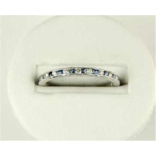 This ANTIQUE Style ETERNITY BAND is 18k White Gold and it features beautiful blue SAPPHIRES alternating with SPARKLING DIAMONDS. There is exquisite etching on the sides. This WEDDING BAND is a Size 7 1/4.