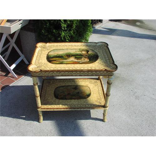 two tiers boudoir table , faux bamboo legs , craquele paint in the beige , top decor "dog" bottom one "flowers". a truely rare and beautifull piece . perfect for dog lovers.