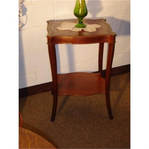 Mahogany side table with leather, gilding top. It has a perfect shape, can fit anywhere in the house or office. Has a small shelf, and simple, shaped legs. Has a few small marks on th etop but these are sign of the age. If you would like to see more pictures please let me know.