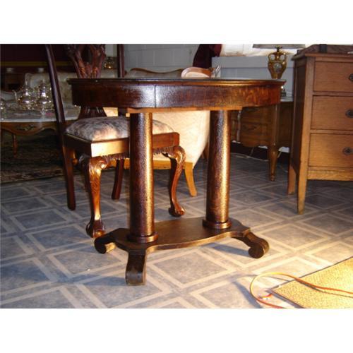 Oak table with oval shaped top. It is on double pedestal with C-scroll legs. Table has a small drawer. It was washed and waxed. Chair is not included. If you would like to see more pictures please let me know.