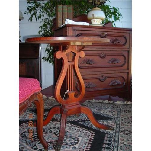 The Lyre-based table with oval shaped top and gilding around the top. Has a white water stain on the top. The ending of the legs are brass feet shape. If you would like to see more pictures please let me know.