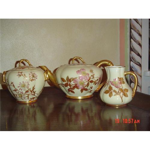 Beautiful 3 piece tea set. Ivory base, roses with gold leaves. Bamboo style handles. Excellent condition.