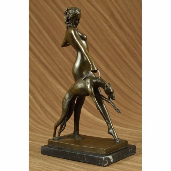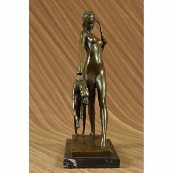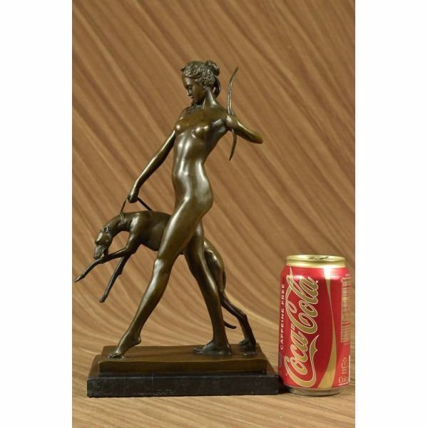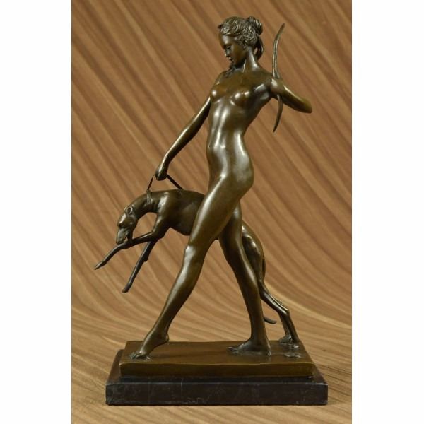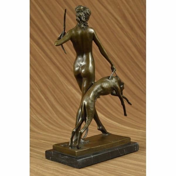 Standing tall and nude this bronze sculpture of Diana the Hunter was handmade and casted using the Lost wax Method. She poses with her small breasts exposed as she releases her bow. You see the outline of her muscles and stomach as she leans back while unleashing her arrow. Standing on her toes she balances herself, bringing detail to her legs, as she looks straight ahead at her target. Her buttocks are tight and firm, her body is slender and natural. You see her muscles in her back and her arms as she shoots her bow. Her hair is wavy but and flows back in the wild winds of the forest. At her feet are large hunting dog. This sculpture was cast using the Lost Wax Method and is mounted on a marble base.Bronze Dimensions with Marble Base each: Height 12 X Width 9 inches. Weight: 8 LBS.