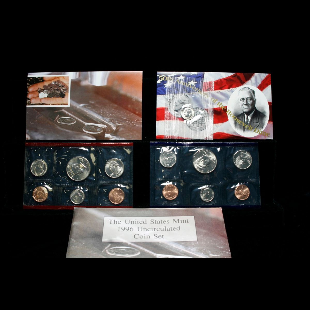 the United States Mint 1996 Uncirculated Coin Set. The 1996 United States Mint Uncirculated Coin Set includes two protective plastic envelopes of 5 coins each, with coins from the United States States Mint at Denver and the other with coins from the United States Mint at Philadelphia. Also included in this set is a Special Roosevelt dime commemorating the 50th Anniversary of the Roosevelt dime from the United States Mint at West Point, for a total of 11 coins. Each Denver and Philadelphia envelope includes:(1) Kennedy half-dollar, (1) Washington quarter, (1)Roosevelt dime, (1) Jefferson nickel, and (1) Lincoln cent. Also included: