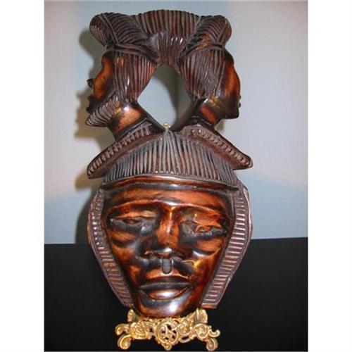 quite unusual and lots of carving. beautiful detail. it is decorative and collectible this 3 heads mask!! it is made of a solid dar wood with touch of red tone. in excellent condition, no crck, chip or crackle. normal wear and tear. has a hook in the back for hanging and mounting on the wall. measures 12 inches tall and 7 inches wide.