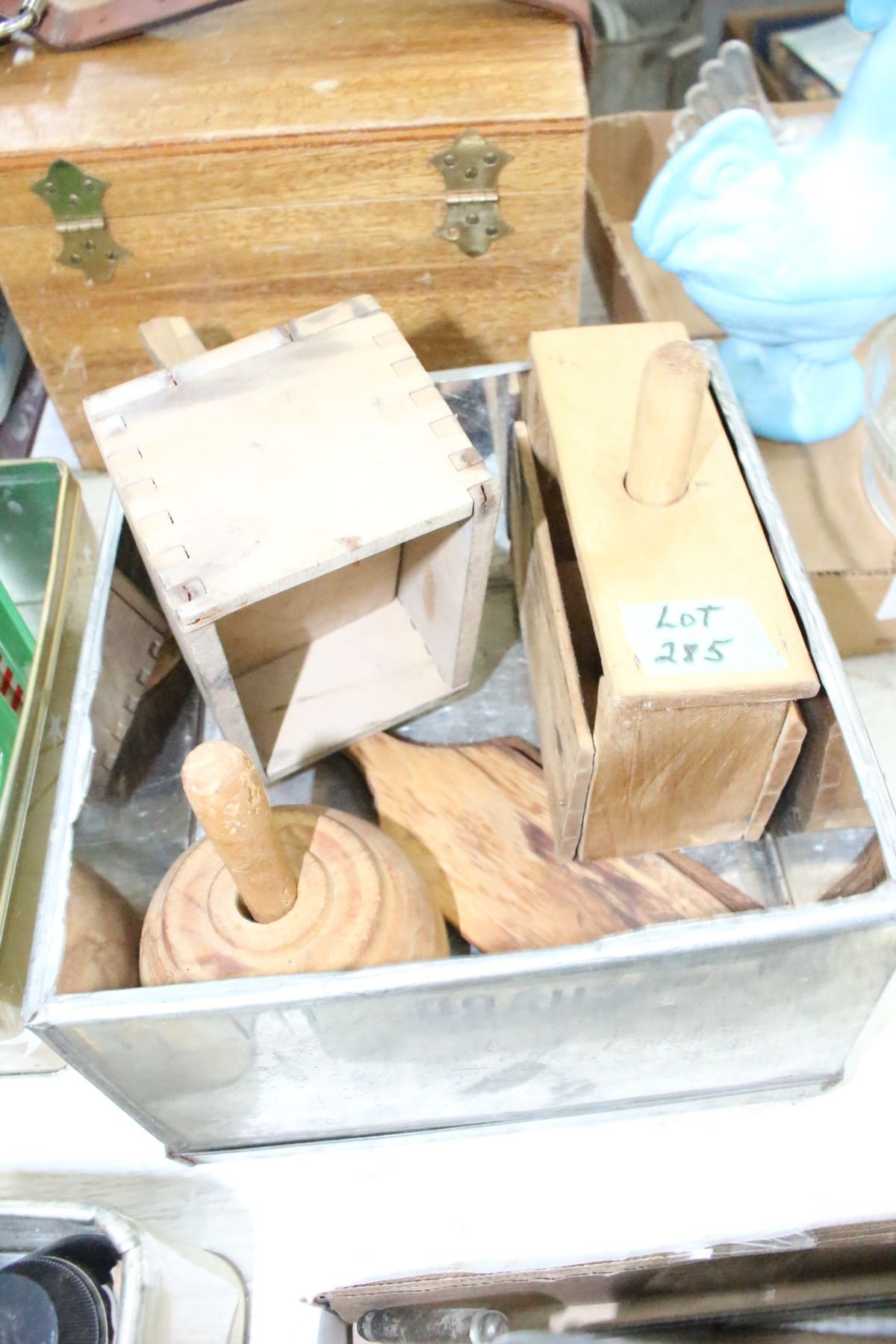 tin of Butter Related Wooden Items; 1 Print; 2 Presses & 2 Paddles