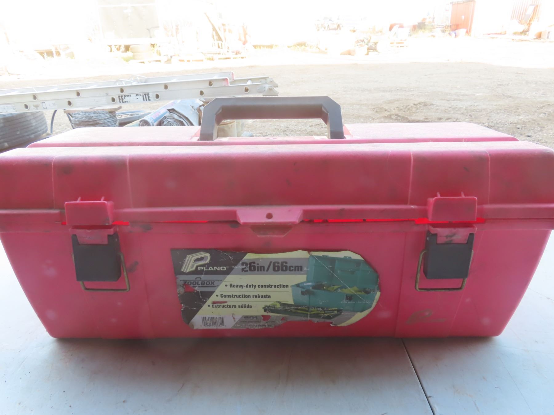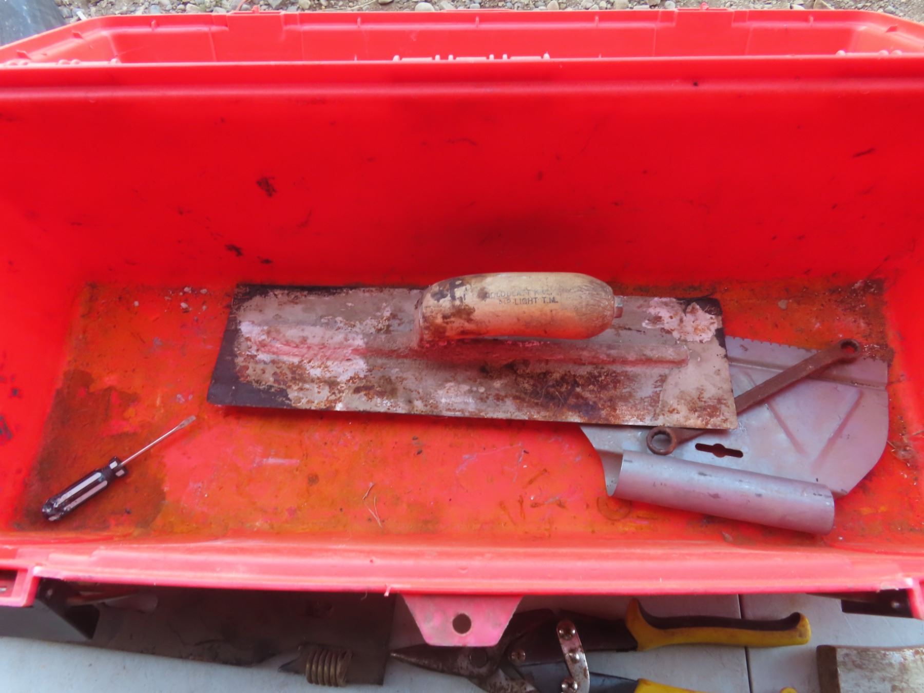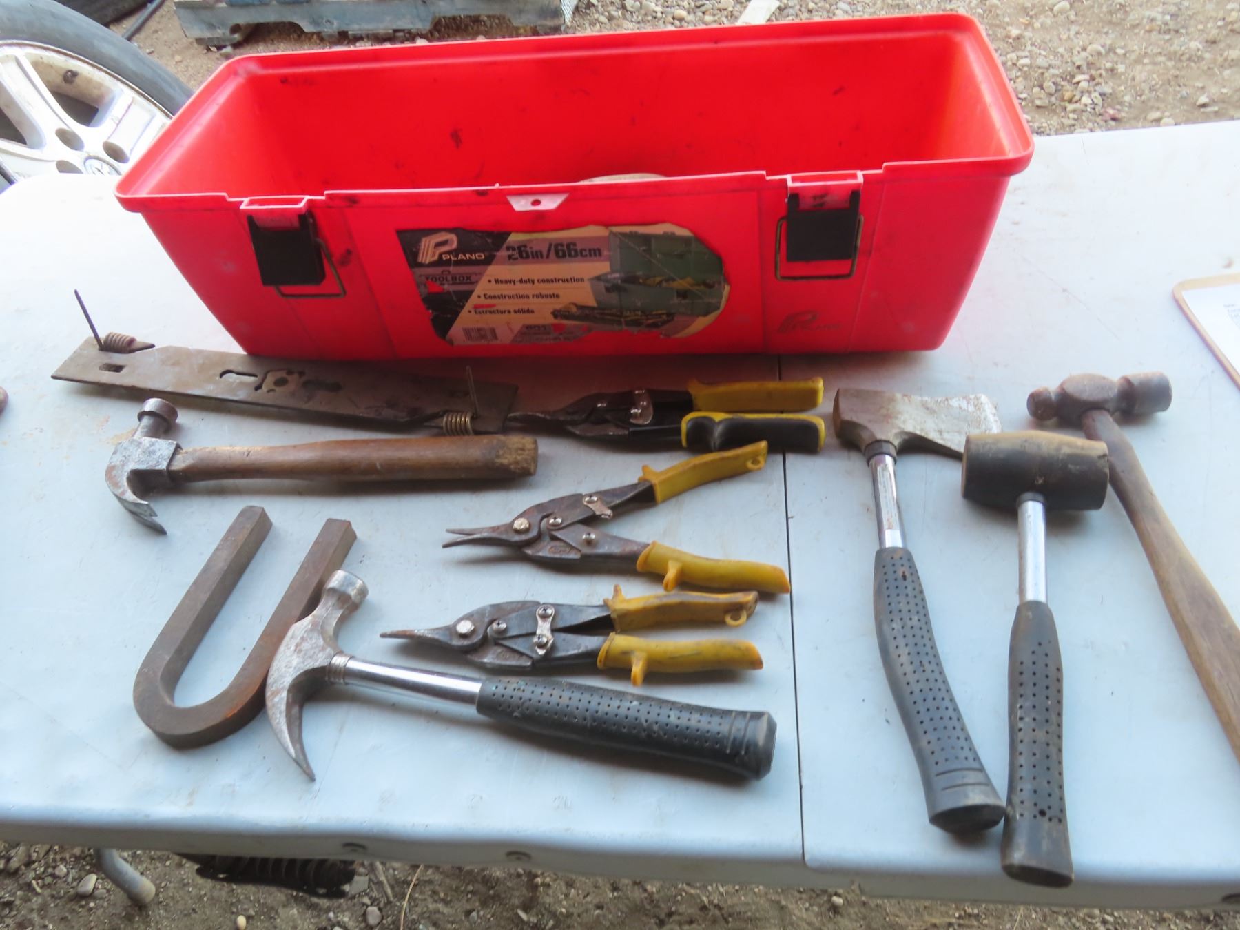 toolbox with hammers, hatchet, small sledge hammer misc