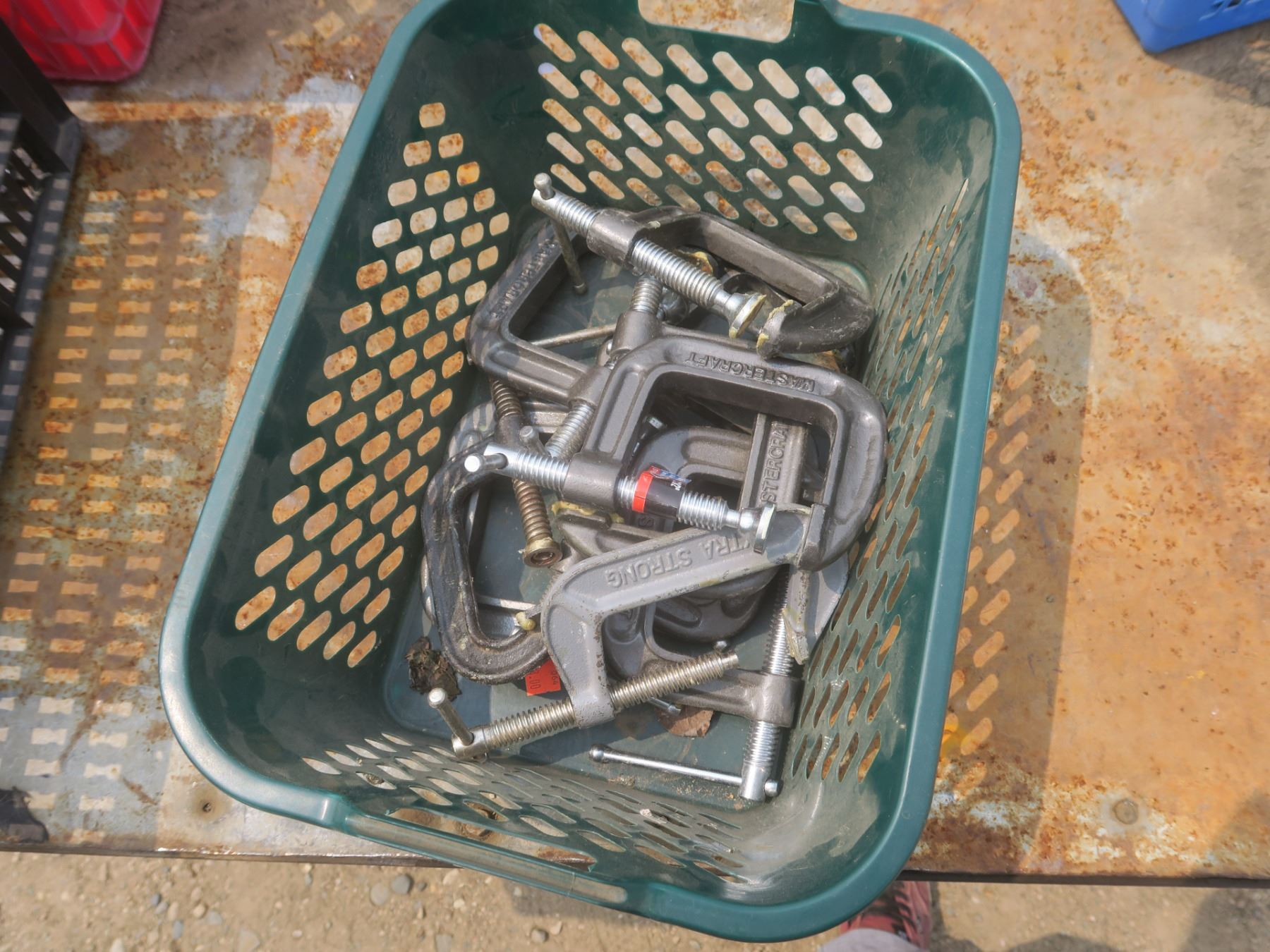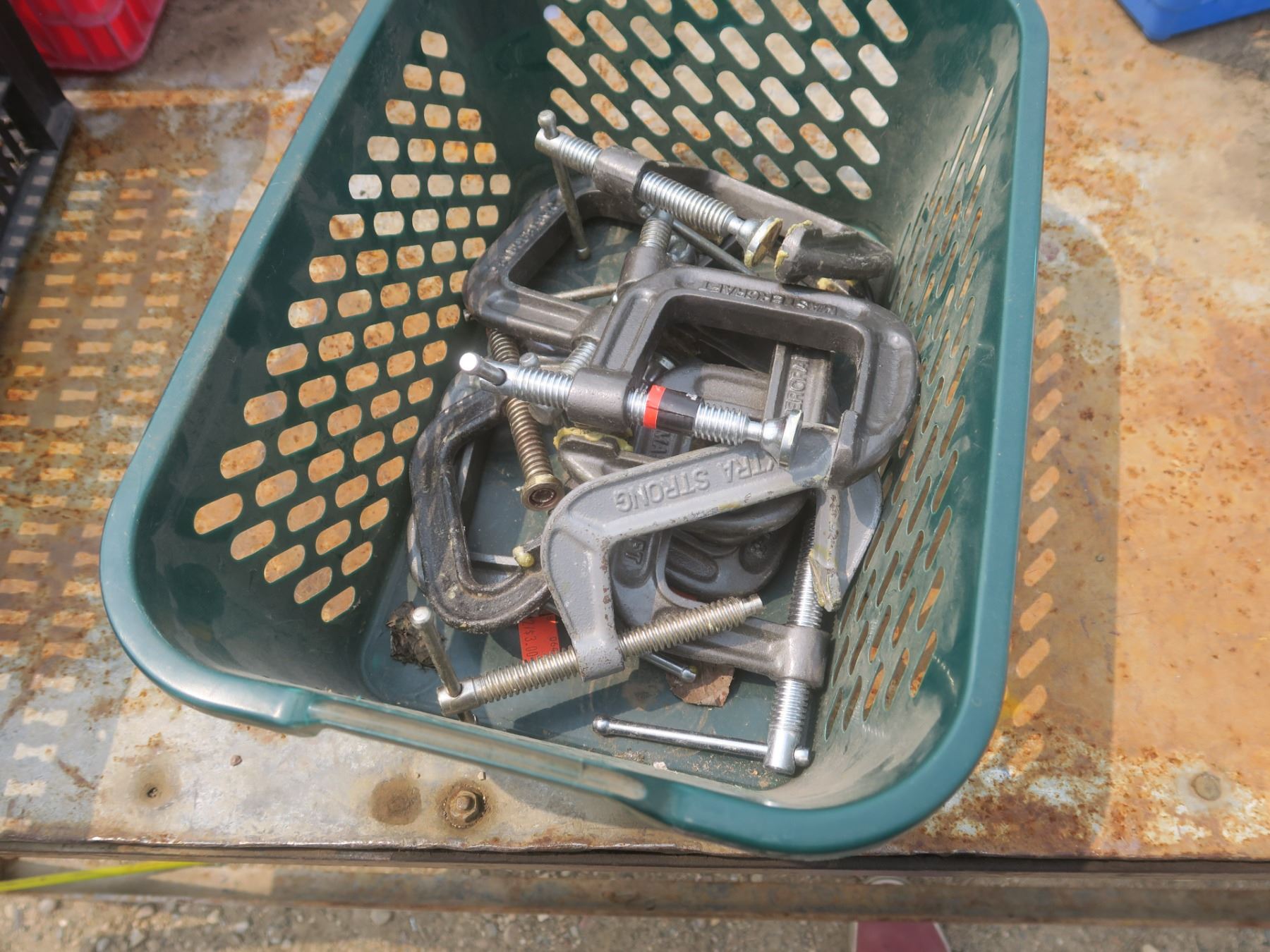 tote of assorted c-clamps