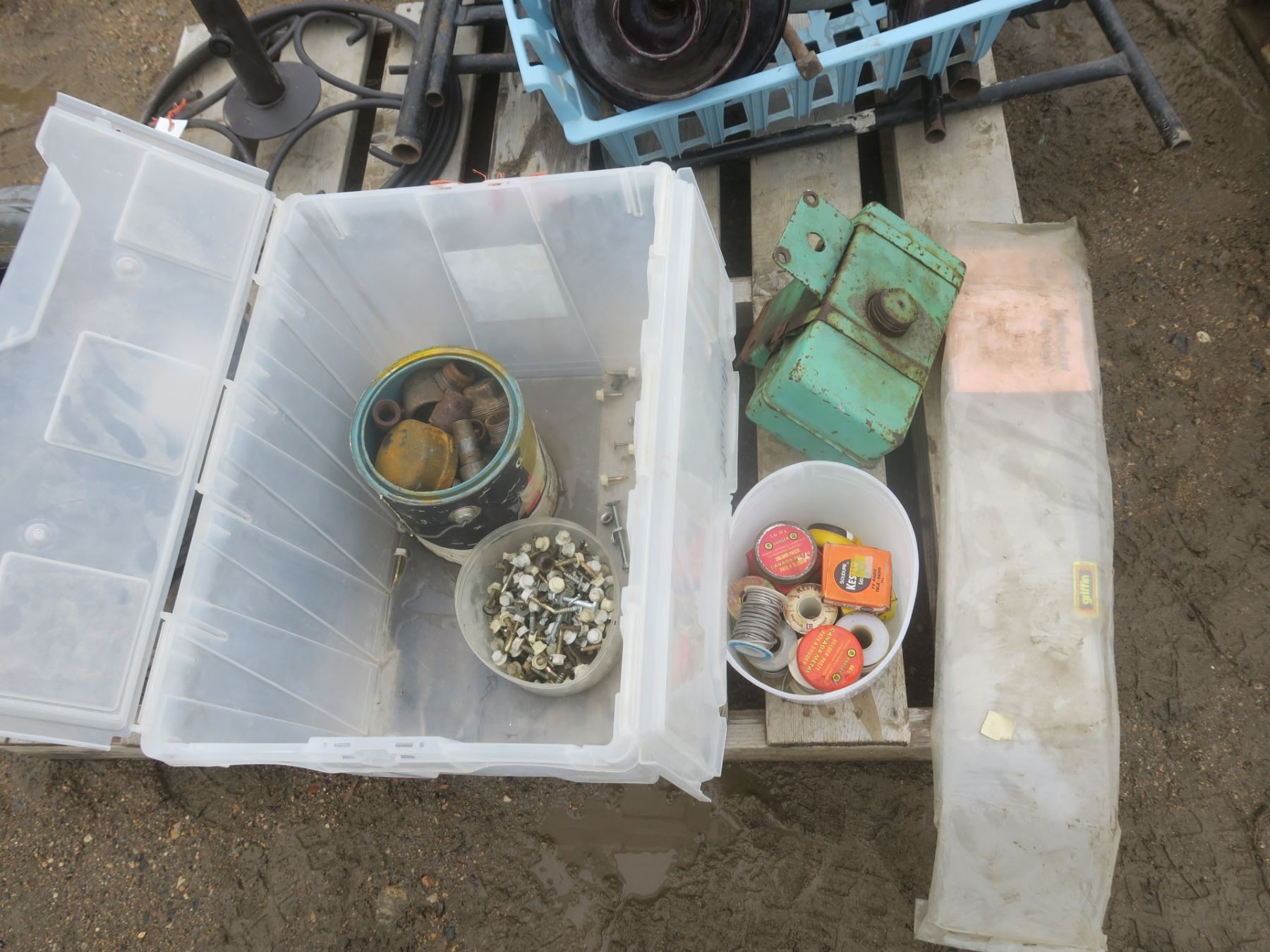 tote of assorted hardware, soldering wire, tank and wind deflector