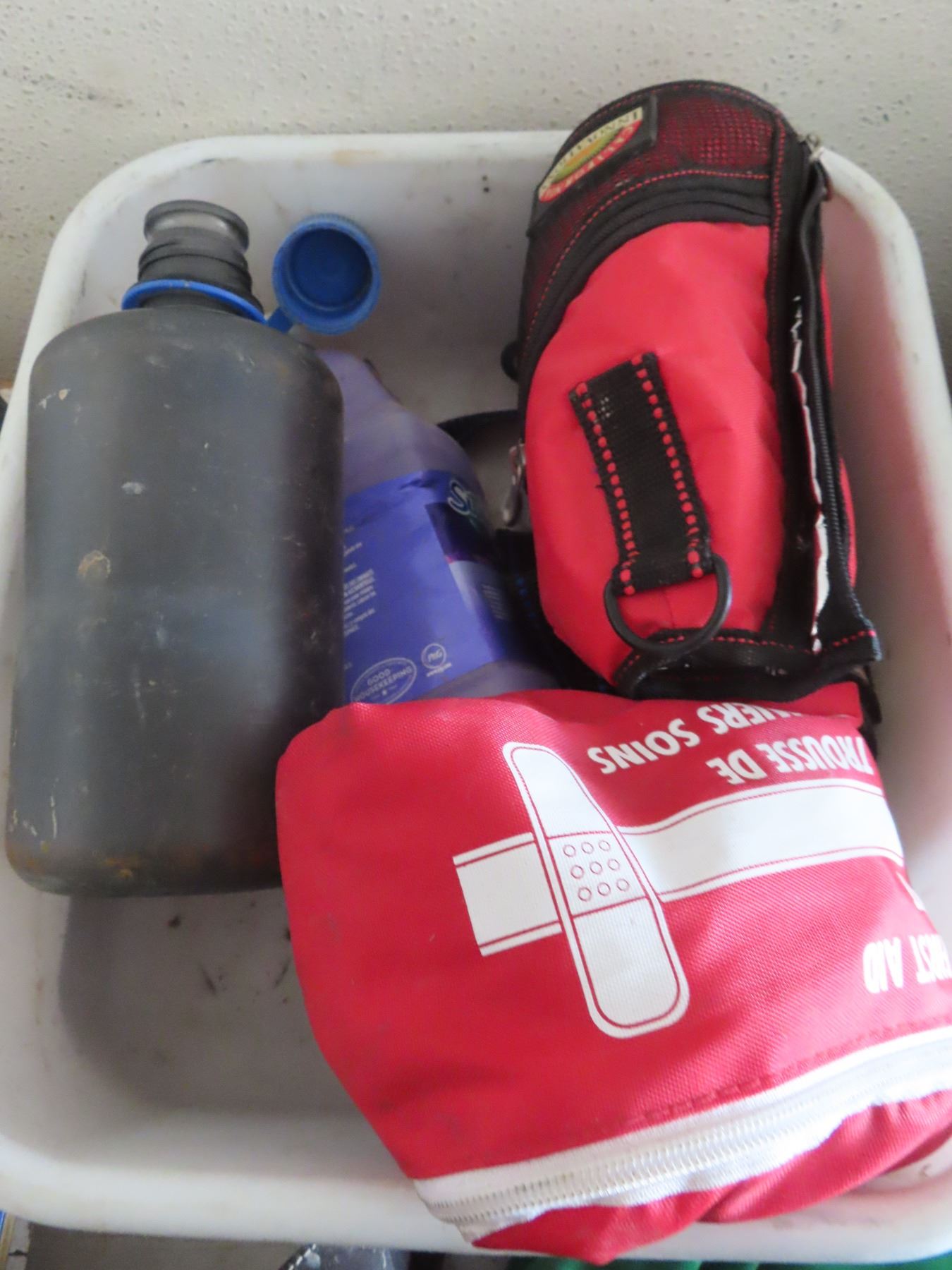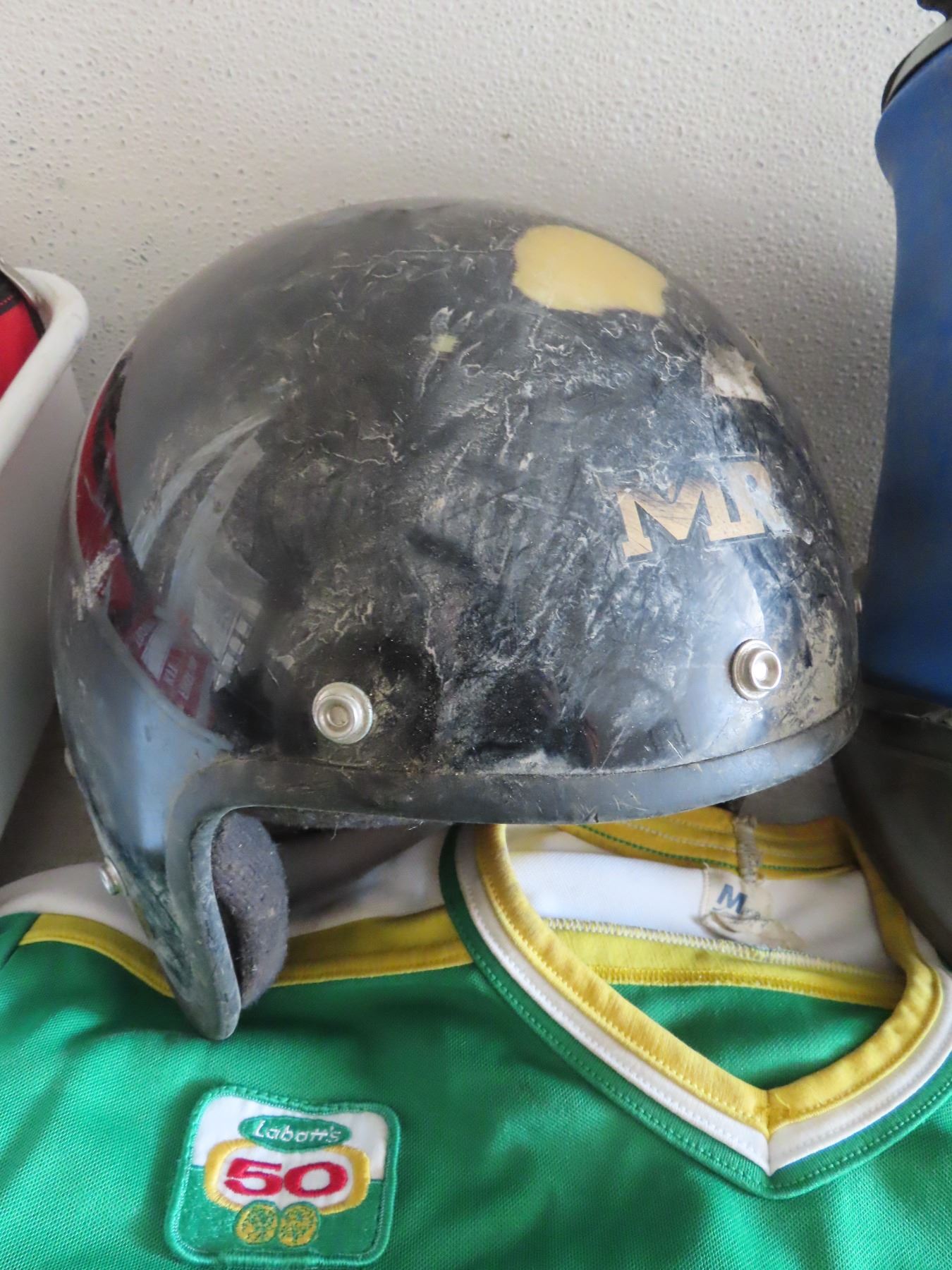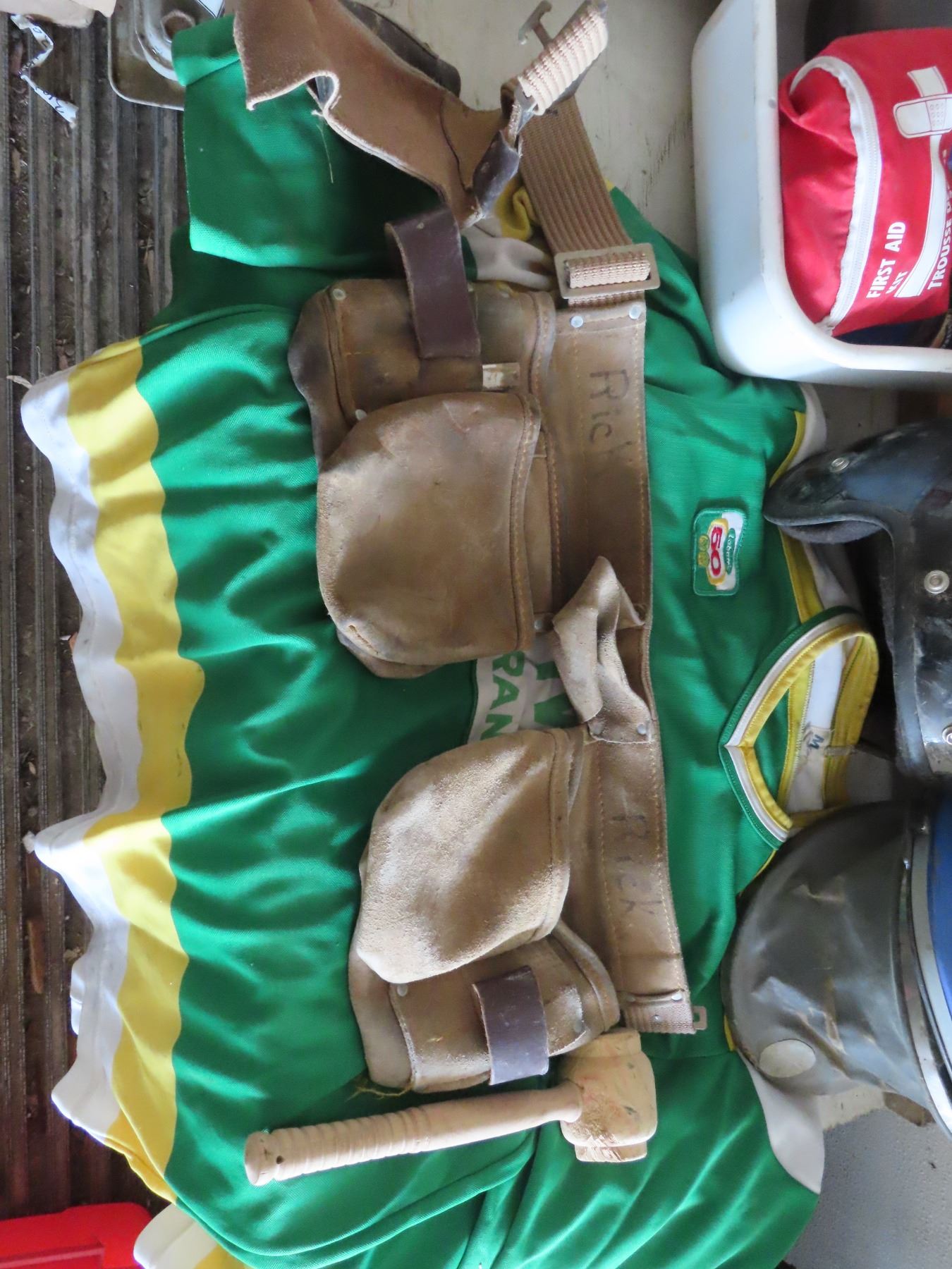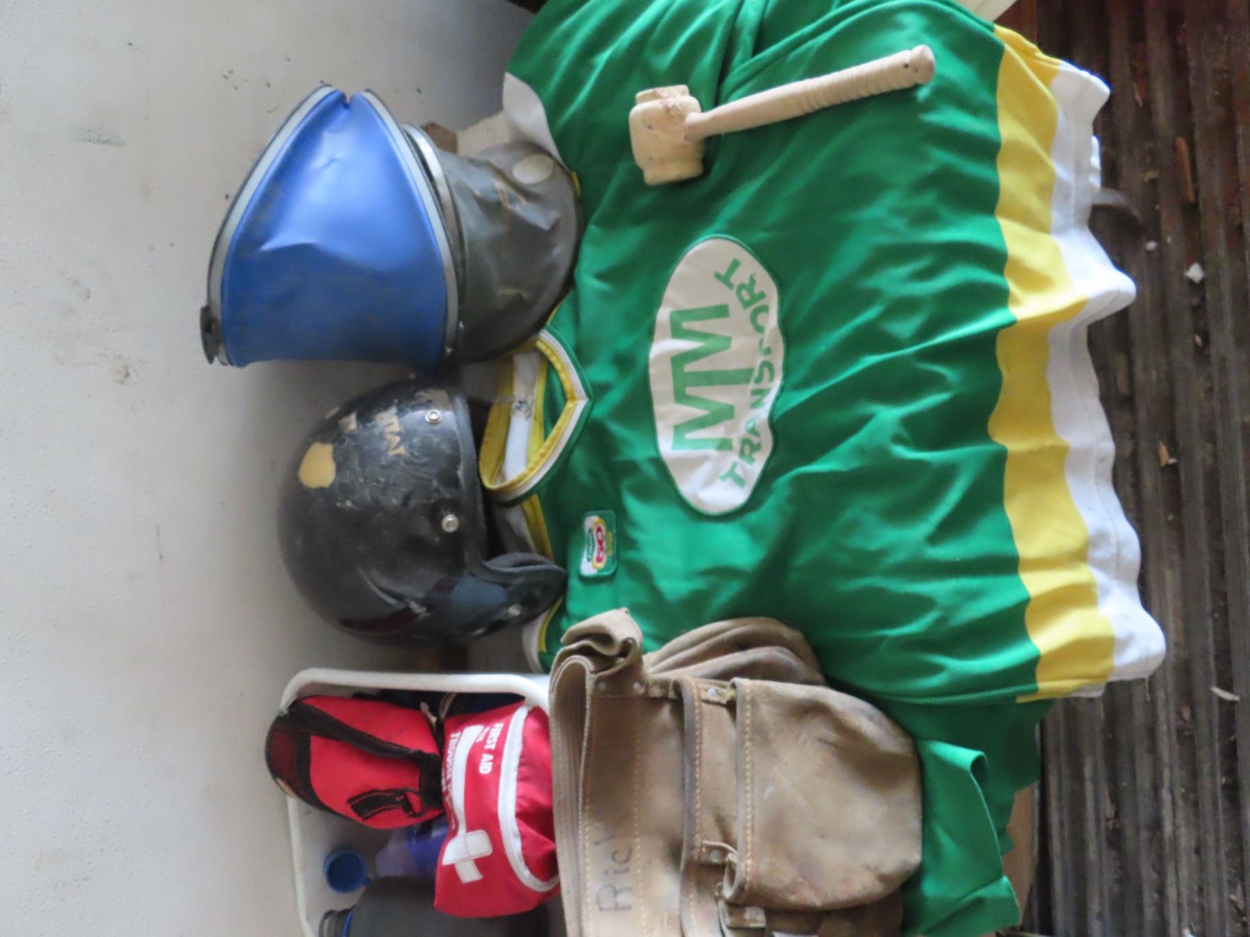 tote with 4 jerseys , helmet ,wattle bottles , tool pouch