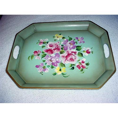 This is an avacada metal tray with an attractive floral design in the center. It has a nice depth and a handle on each side for carrying. The tag on the back says it is chip and alcohol resistant. It can be used as a tray and/or hung on the wall.