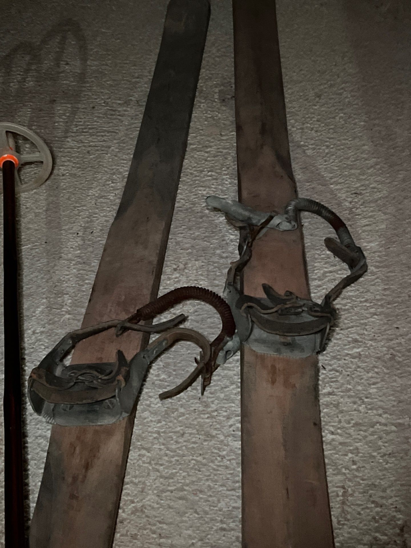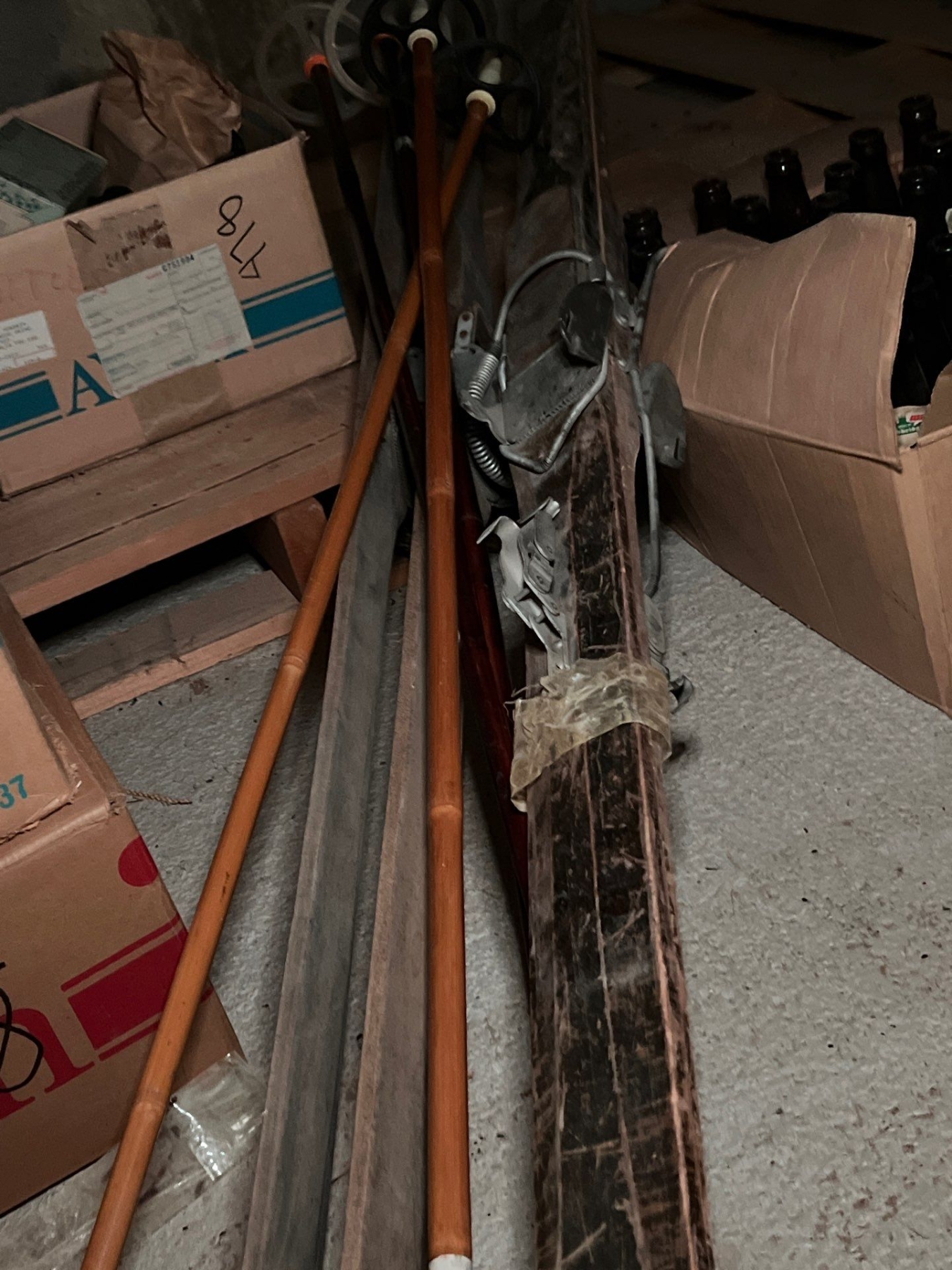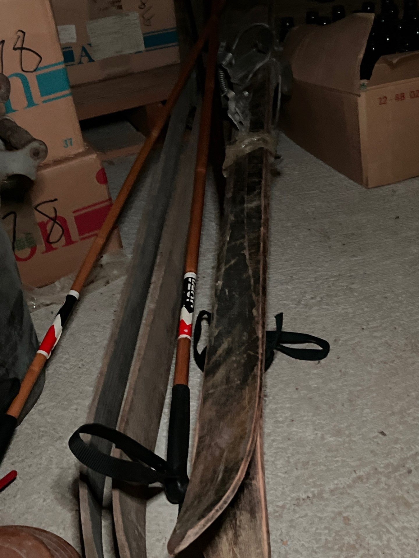 two antique sets of downhill skis, including a number of sets of bamboo poles