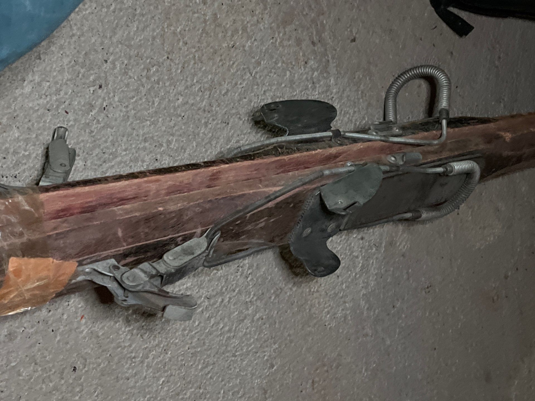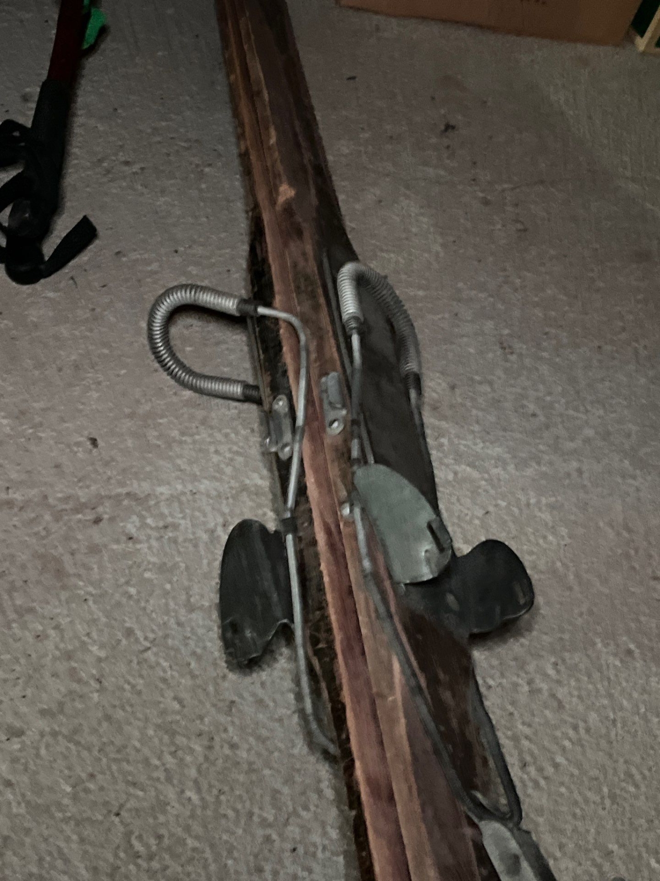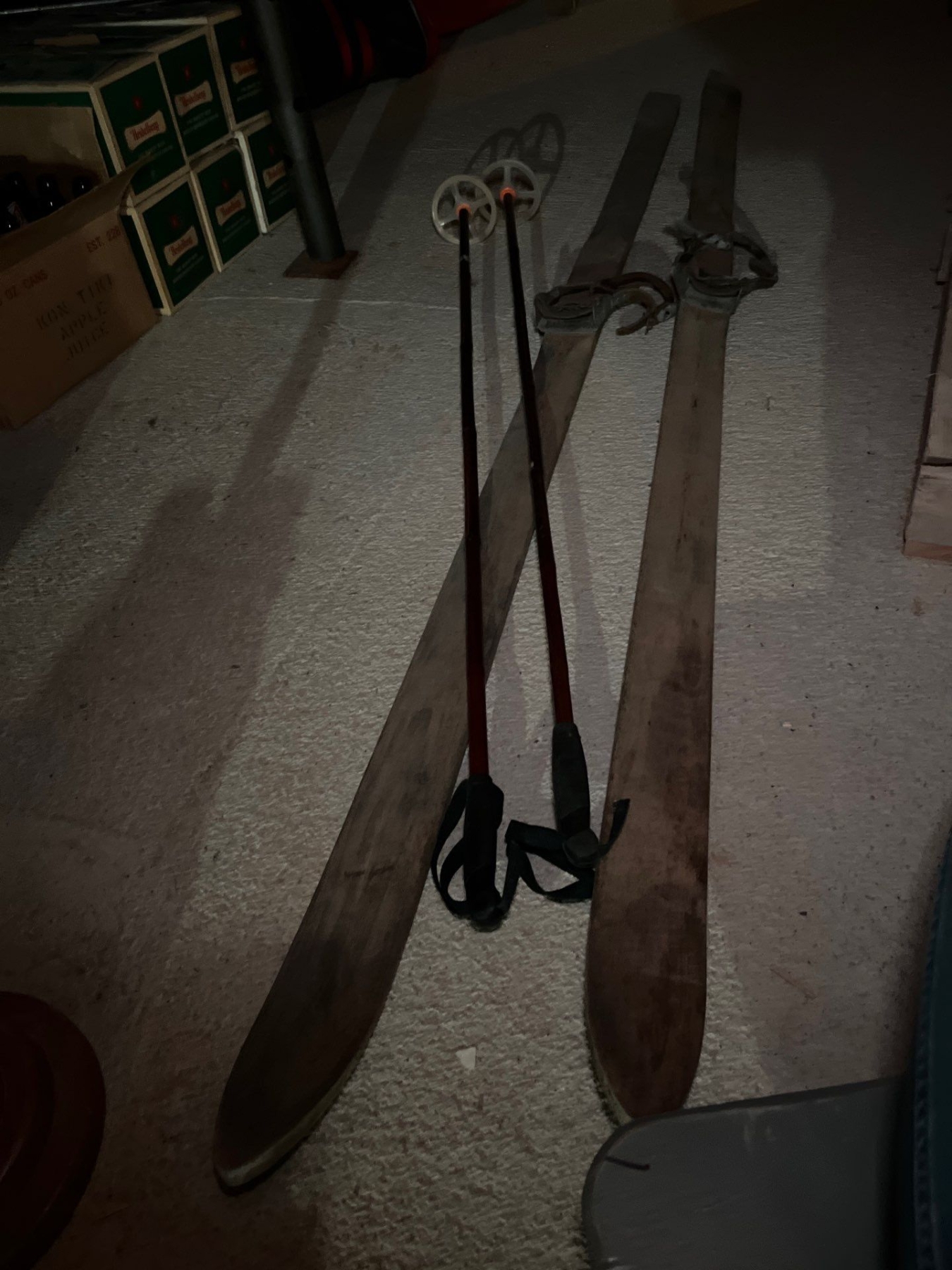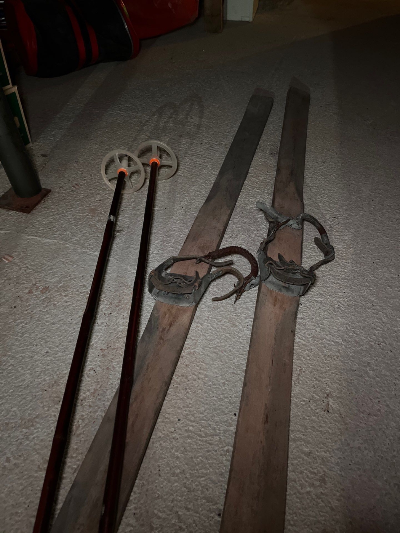 two antique sets of downhill skis, including a number of sets of bamboo poles