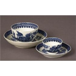 Caughley Works, Nr. Broseley, Shropshire, circa 1785, printed S mark, the larger saucer Worcester, with printed crescent mark. With standing fisherman with catch and nets.Literature: Pattern illustrated in G. Godden, Caughley and Worcester Porcelain, plate 177.