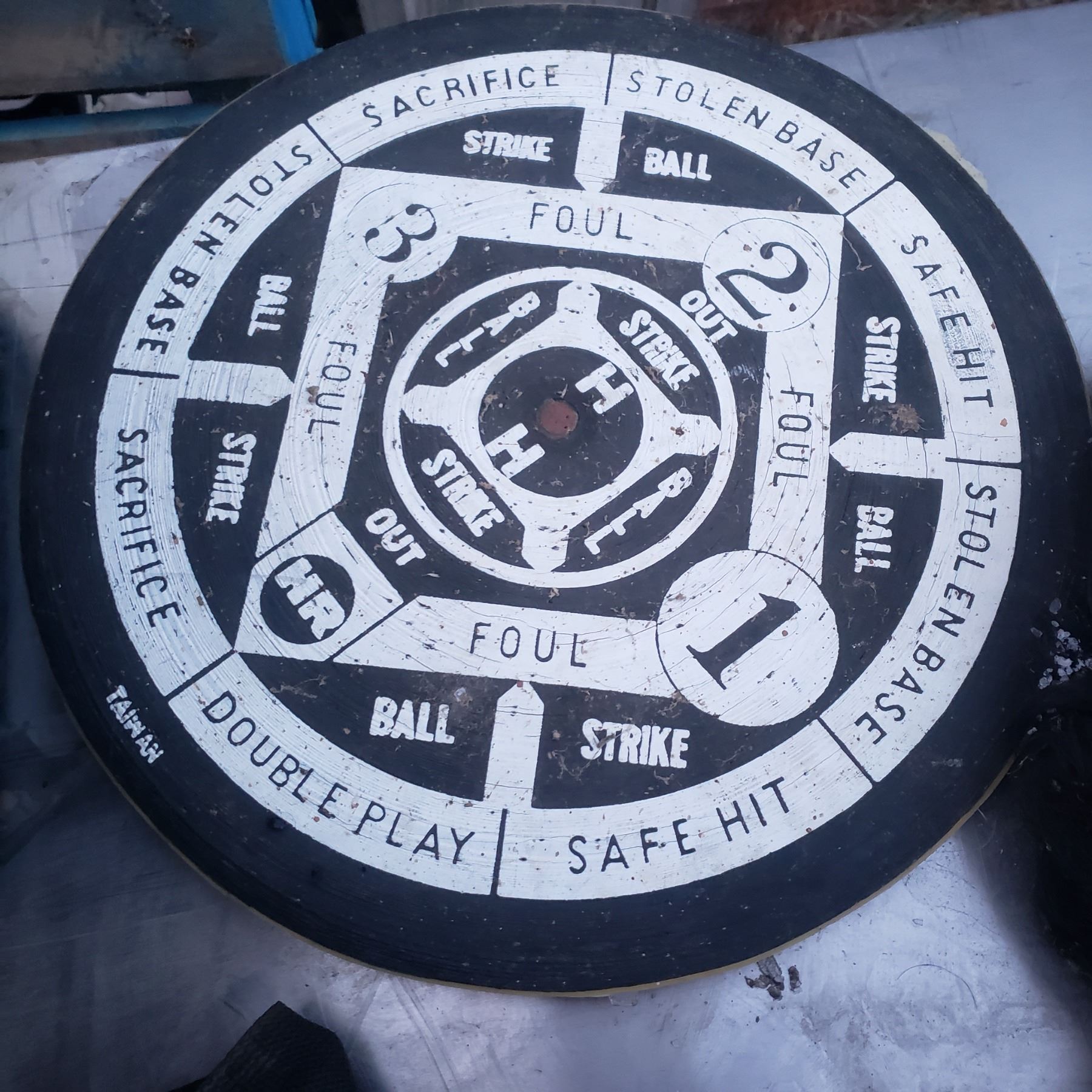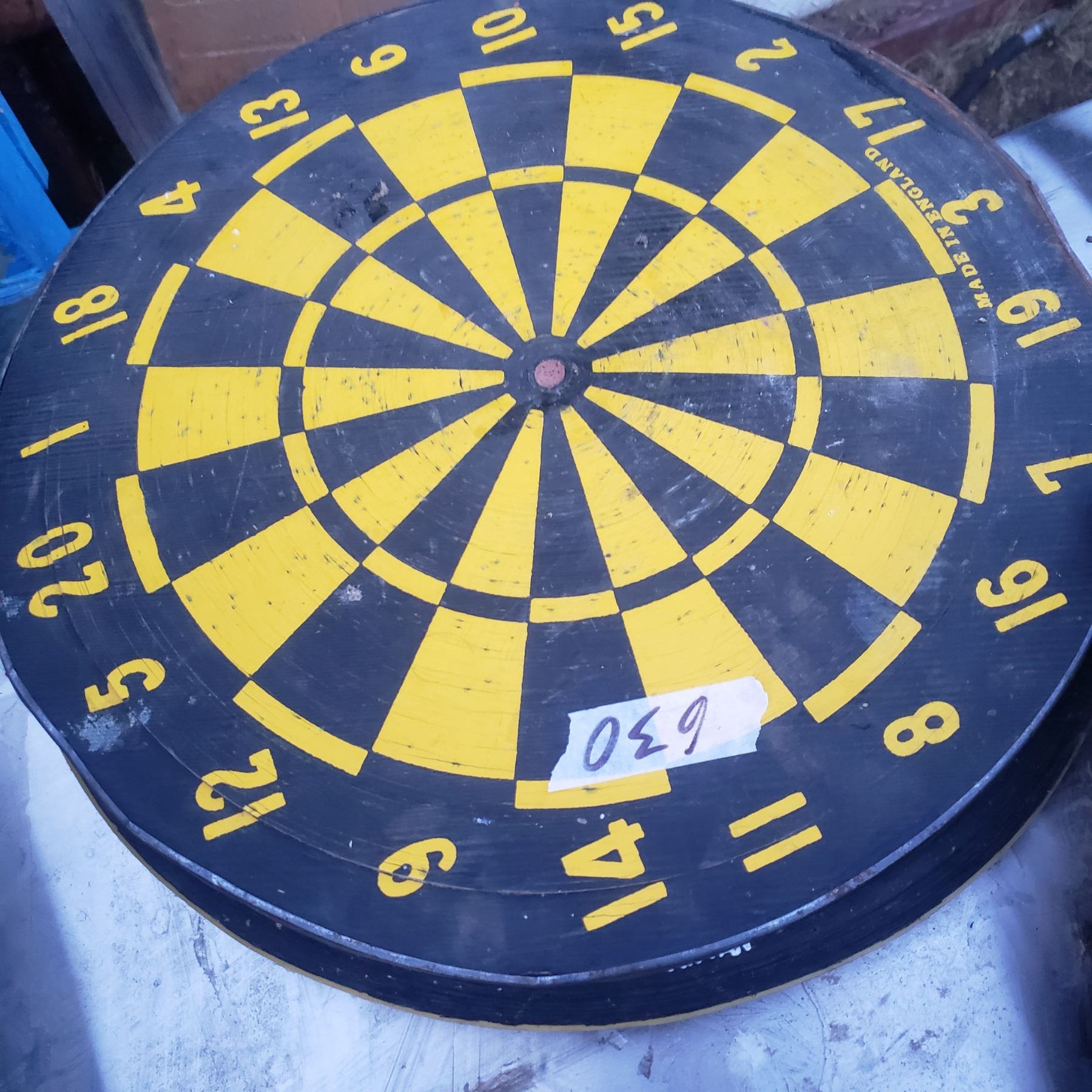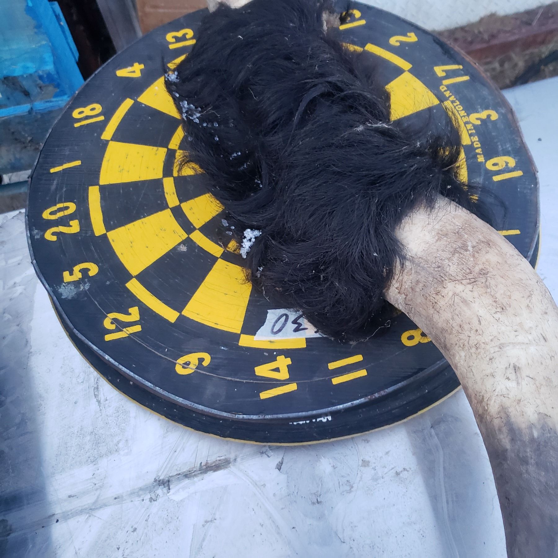 two dart boards - one has darts baseball game, and horns.