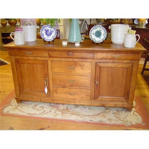 We must begin to dscribe this fabulous cherry enfilade by telling you about its incredible color. It is rich and golden , highlighted by lovely light and dark grain. It has three top drawers(perfect for flatware storage), three larger drawers flanked by two doors, which when opened have been divided by one shelf. this is the ideal server for your dining or living room area.