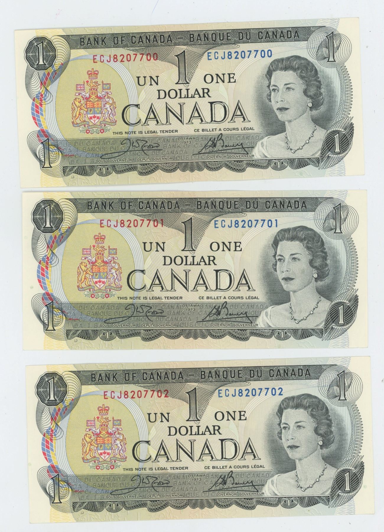 uncirculated 1973 bank of Canada one dollar bill X3 (sequential)