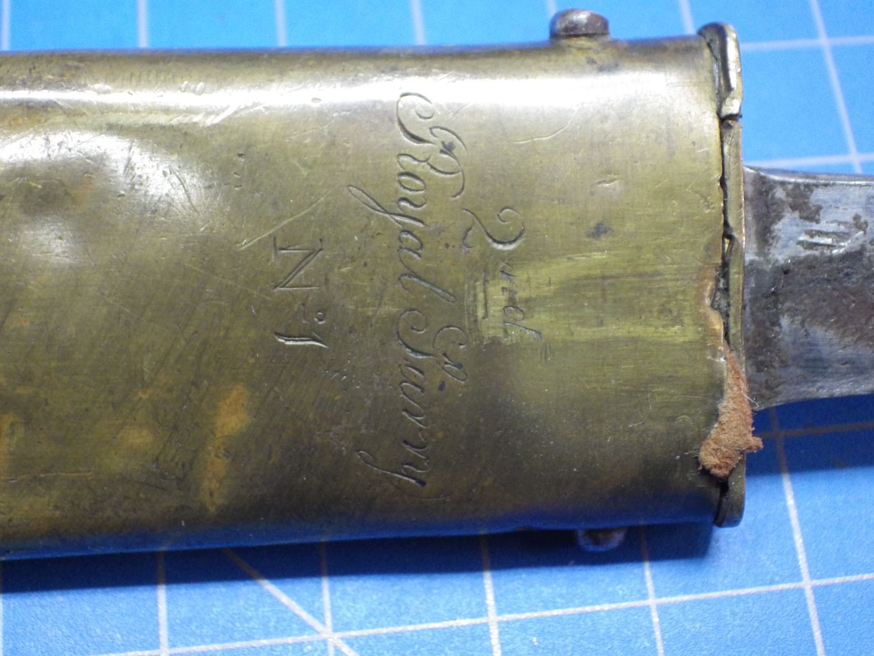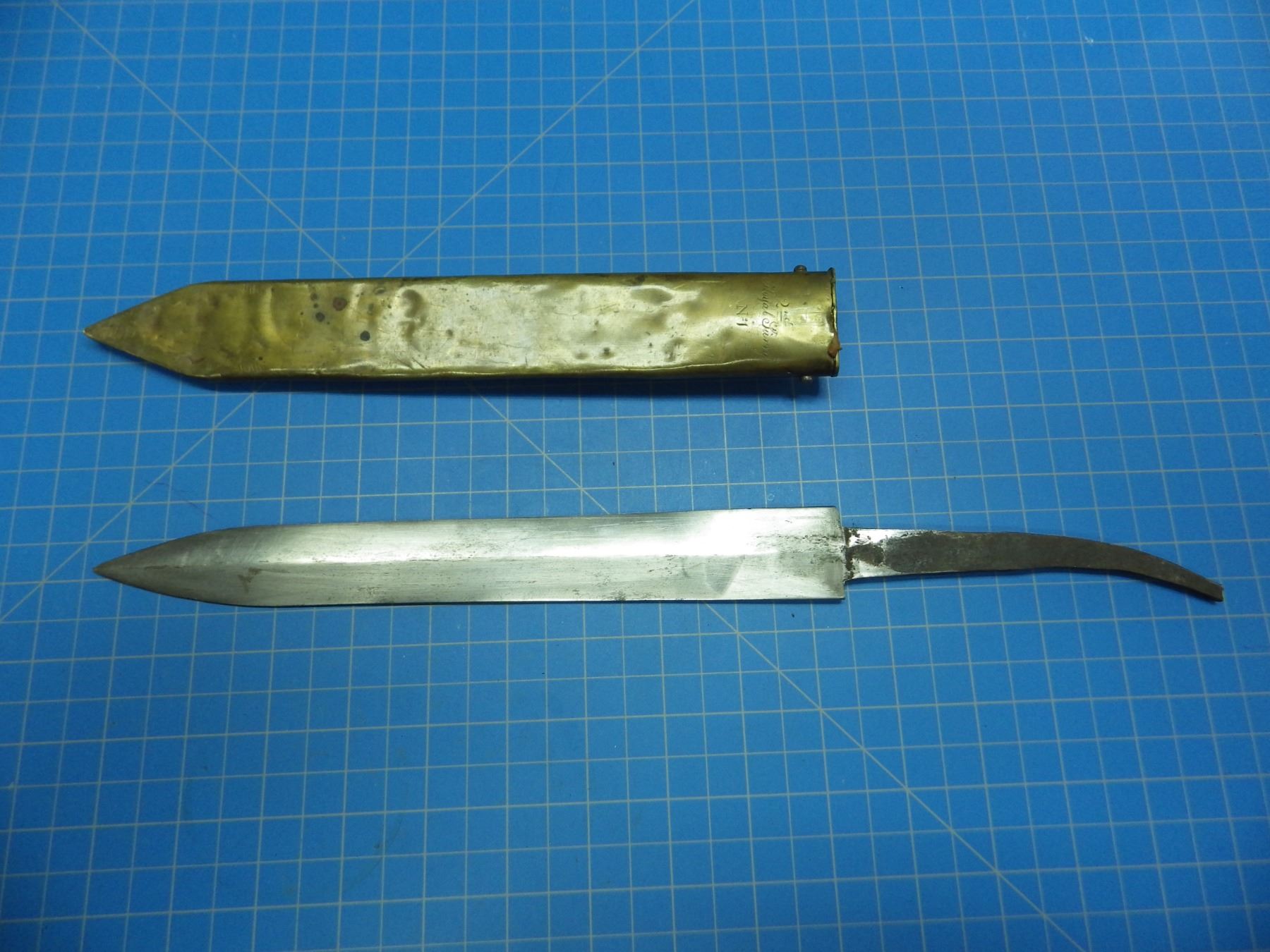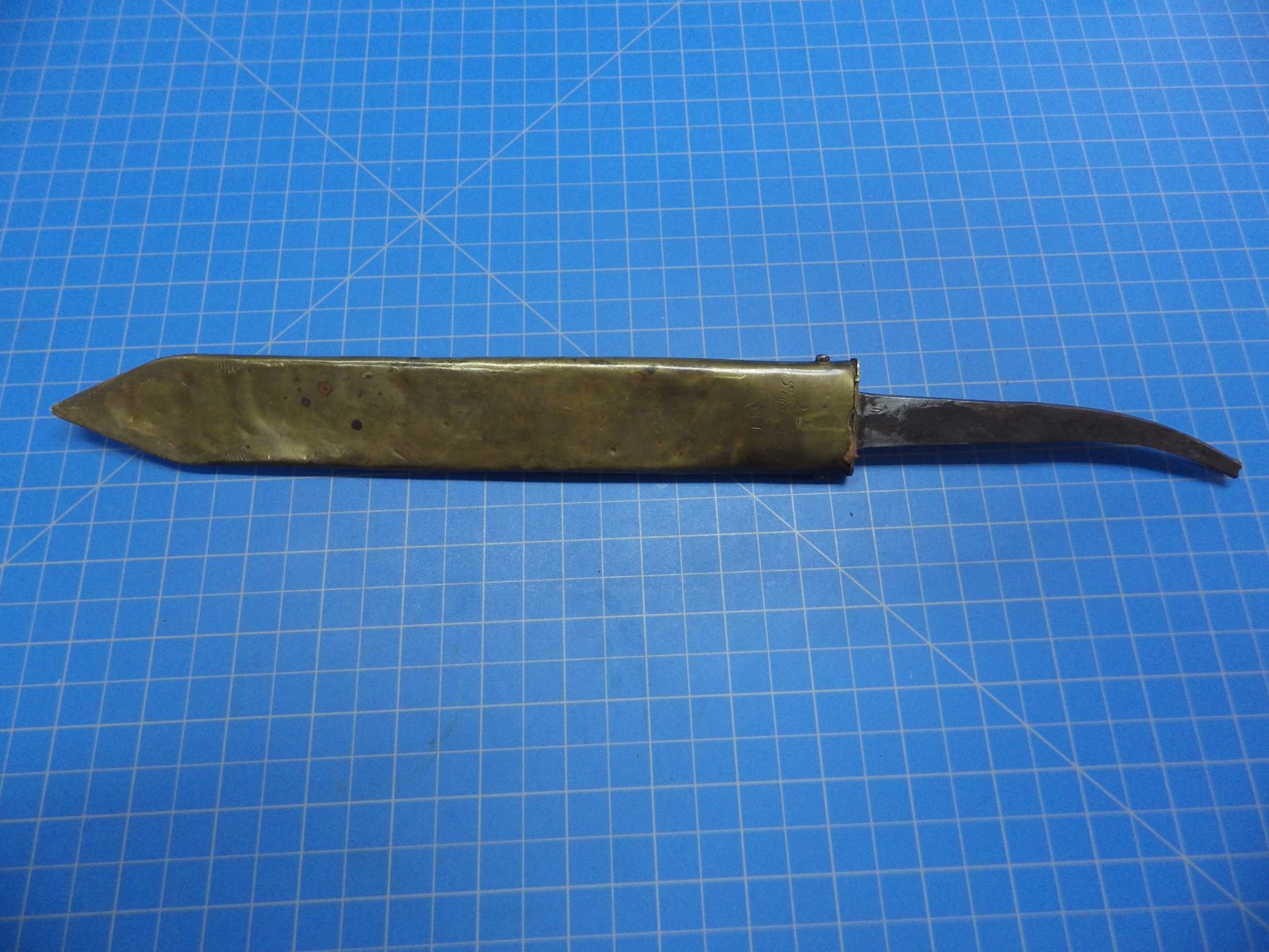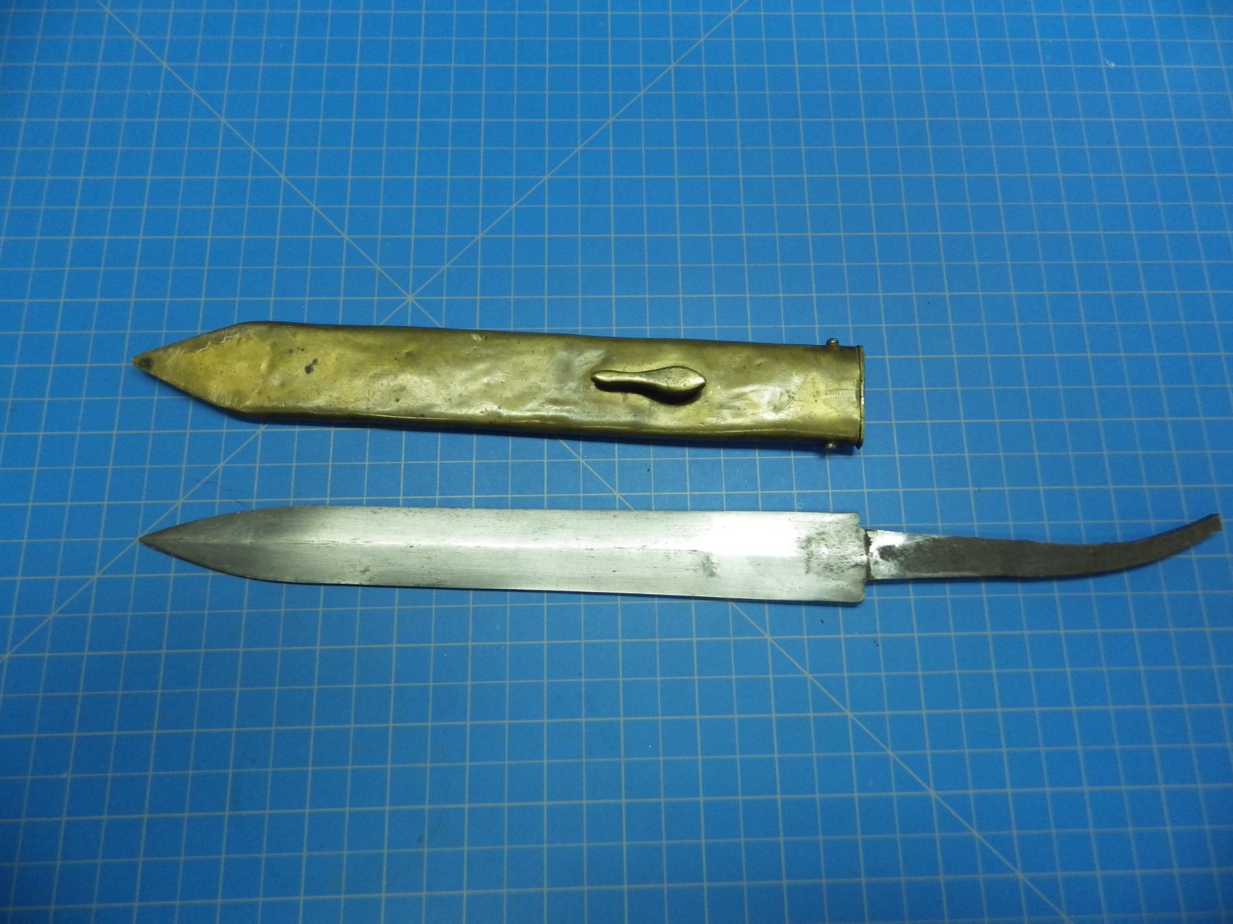 unknown 9 3/4" double edged blade in brass sheath marked 2nd Royal Surry no. 1