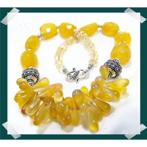 A remarkable artisan creation for those that adore the charming complimentary shapes ...droplets, fully faceted chalcedony, citrine rondells complimented with the finest in tribal silver. If you love a sunny FALL day this piece of jewelry is for you!<p>