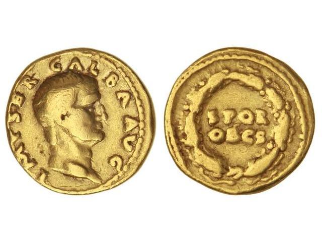 Áureo. 68-69 d.C. GALBA. Anv.: IMP. SER. GALBA AVG. Cabeza descubierta a derecha. Rev.: S. P. Q. R. OB C. S. dentro de guirnalda de hojas de roble. 7,20 grs. AU. C-286. MBC-.