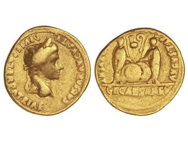 Áureo. - Acuñada el 2 a.C.-14 d.C. - AUGUSTO. - Anv.: CAESAR AVGVSTVS DIVI F. PATER PATRIAE. Cabeza laureada a derecha. Rev.: C. L. CAESARES AVGVSTI F. COS. DESIG. PINT. IVENT. Cayo y Lucio César en pie, en medio sendos escudos, arriba símpulo y lituo. 7,70 grs. (Pequeñas rayitas). C-42; XC-176. MBC-/BC+. - -