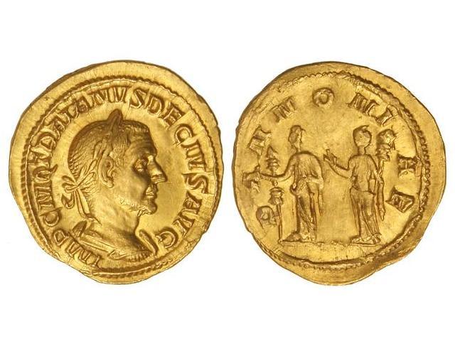 Áureo. Acuñada el 249-251 d.C. TRAJANO DECIO. Anv.: IMP. C. M. Q. TRAIANVS DECIVS AVG. Busto laureado a derecha. Rev.: PANNONIAE. Las dos Panonias en pie de frente mirando a derecha y a izquierda, con insignias militares. 4,63 grs. AU