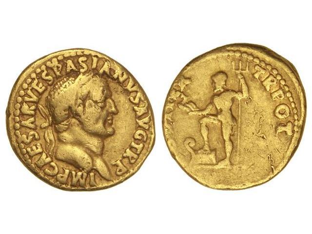Áureo. Acuñada el 70 d.C. VESPASIANO. Anv.: IMP. CAESAR VESPASIANVS AVg. TR. P. Cabeza laureada de Vespasiano a derecha. Rev.: (COS. I)TER. TR. POT. Neptuno de pie a izquierda. Pie sobre proa de nave. 7,30 grs. AU. (Golpecitos). XC-61
