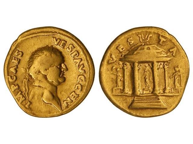 Áureo. Acuñada el 73 d.C. VESPASIANO. Anv.: IMP. CAES. VESP. AVG. CEN. Cabeza laureada de Vespasiano a derecha. Rev.: VESTA. Templo redondo tetrástilo, con tres estatuas. 6,90 grs. AU. ESCASA. C-578; XC-690. BC+.