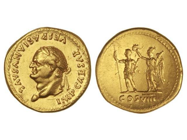 Áureo. Acuñada el 77-78 d.C. VESPASIANO. Anv.: IMP. CAESAR VESPASIANVS AVG. Cabeza laureada de Vespasiano a izquierda. Rev.: COS. VIII. Vespasiano de pie a izquierda, con lanza y rollo en su izquierda, es coronado por Victoria con pal