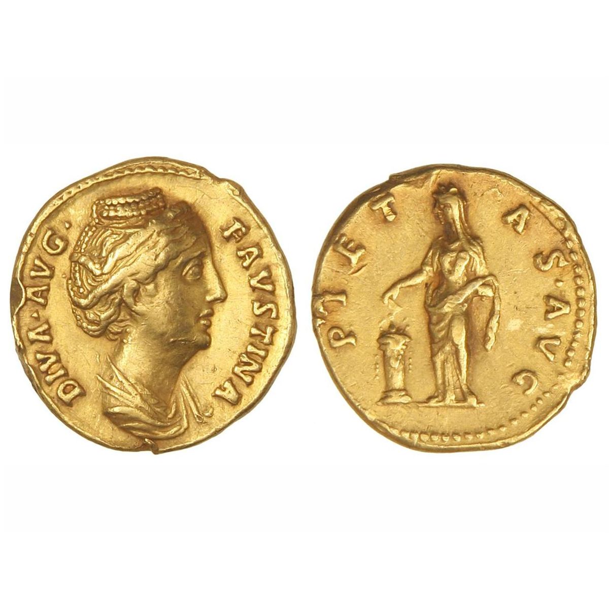 Áureo. - Posterior al 141 d.C. - FAUSTNA MADRE. - Anv.: DIVA AVG. FAVSTINA. Busto a derecha. Rev.: PIETAS AVG. Piedad a izquierda con velo, derramando incienso sobre altar. 7,05 grs. AU. (Pequeños golpecitos). C-233; XC-1799. EBC-. - -