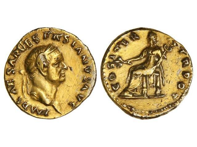 Áureo forrado. (69-70 d.C.). VESPASIANO. Anv.: IMP. CAESAR VESPASIANVS AVG. Busto laureado a derecha. Rev.: COS. ITER. TR POT. La Paz sentada a izquierda. 3,33 grs. XC-tipo 607. MBC+.