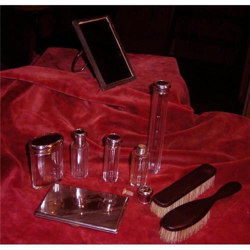 5 beveled glass bottles with metal caps,a mirror, an Art Deco metal cigaret box and 2 brushes.