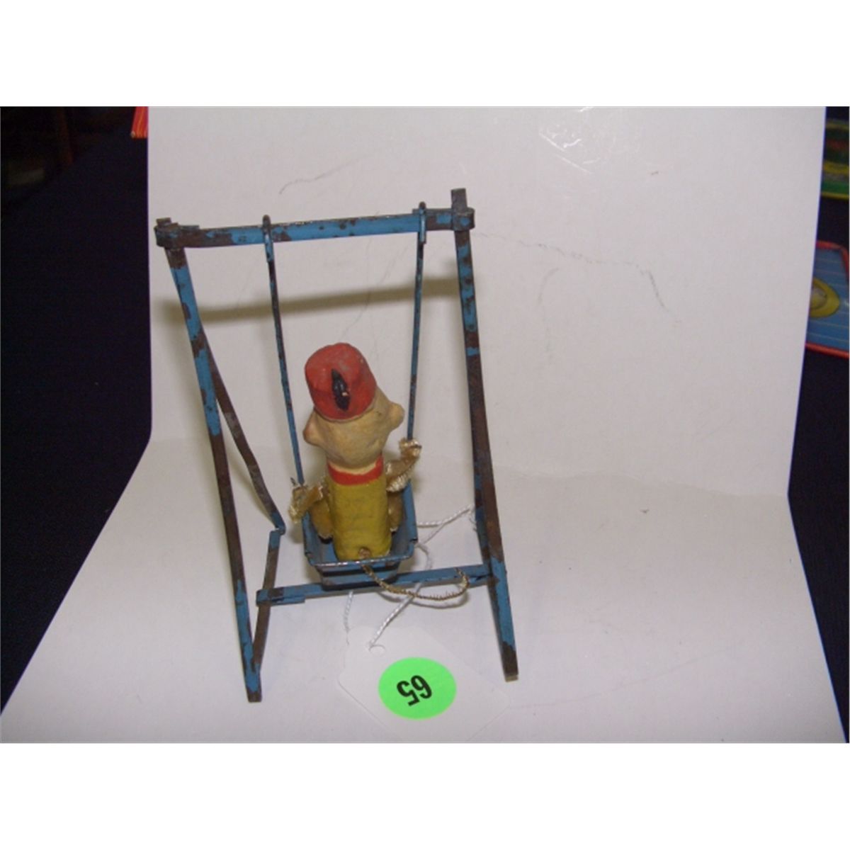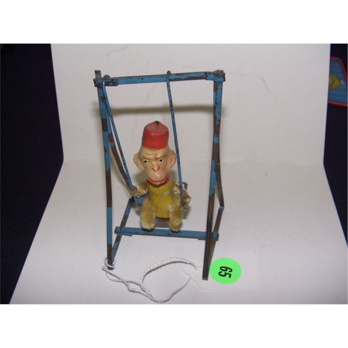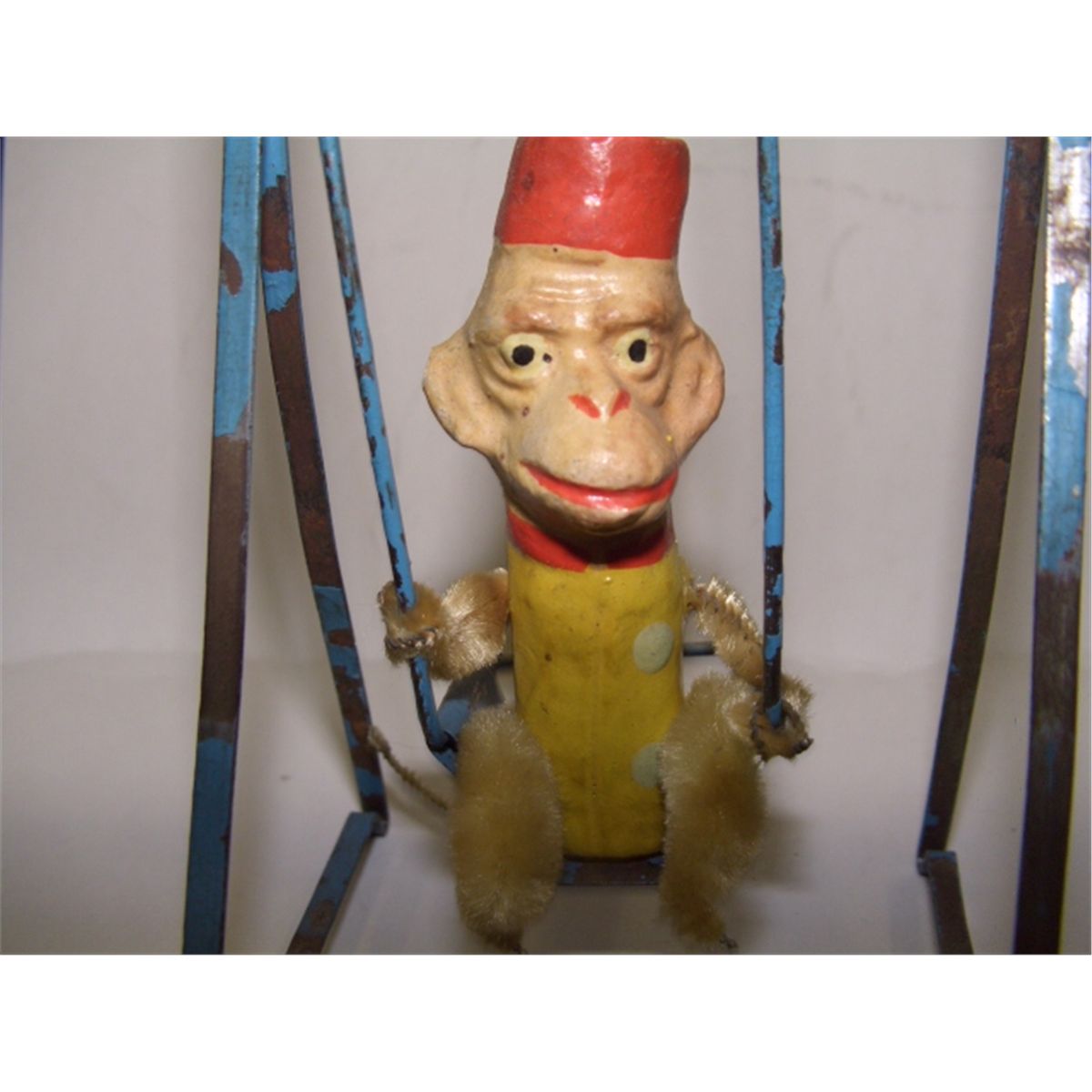 very old child's swinging monkey toy on metal swing frame