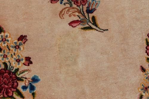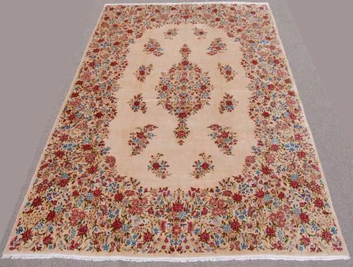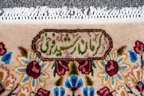 extremely rare and gorgeous handmade persian kerman rug. size 15.2 x 9.8 feet, pure silk and wool pile on cotton foundation, all natural vegetable dye, with a beige background, an absolutely gorgeous large rose floral centerpiece medallion and a matching, unusually thick and stunning rose floral trim. signed by the master weaver kerman rashid farokhi, who was one of the most famous master persian rug weavers in the industry. this stunningly beautiful rug will catch everyone's eye with its aesthetic appeal. very rare and highly collectible masterpiece authentic persian rug. comes with a certificate of authenticity. country of origin, iran. about kerman rugs, since the seventeenth century, kerman has been a major center for the production of high-quality carpets. the so-called vase carpets of the safavie period are among the greatest masterpieces of persian weaving. when persian rug production moved into high gear in the later nineteenth century, kerman once again emerged as a producer of the finest carpets in the best persian tradition. kerman carpets of this period, particularly the lavar type, are known for the fineness of their weave and for their elegantly drawn designs of classical derivation, both in allover and central medallion formats. the palettes of kerman rugs are extremely varied and it ranges from examples, which emphasize ivory, blue, and magenta tones to those with a more golden, saffron cast. note, as the last picture shows, there is a small yellow spot on rug.