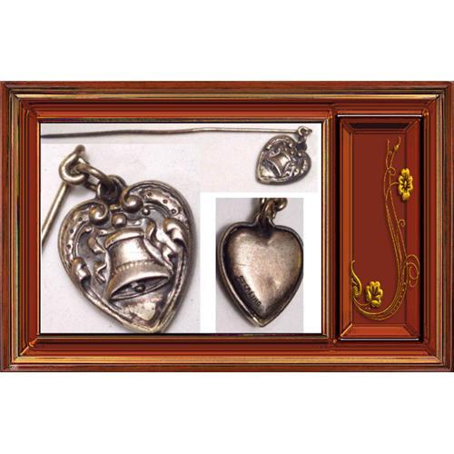 This is part of a stickpin charm collection that I am just now offering to the public.These hearts on charm bracelets are very collectible and this one is even more unusual because it has a bell in the center in repousse work. The pin is 3? long and the heart is just under one inch and it it marked sterling.