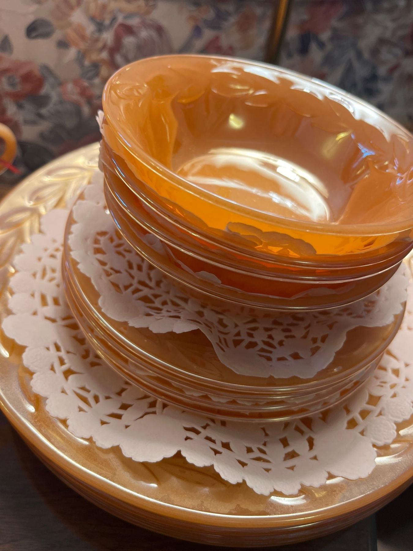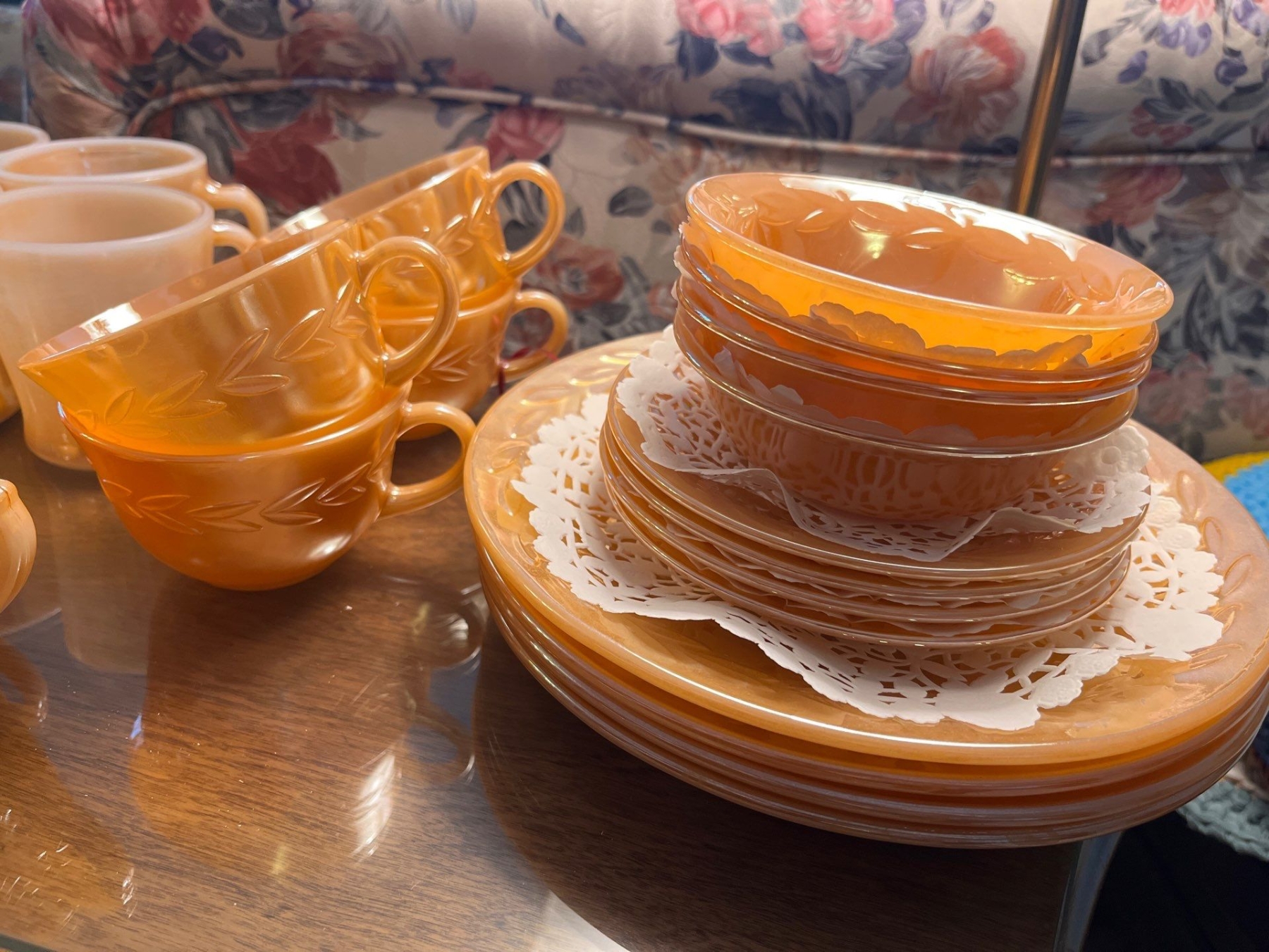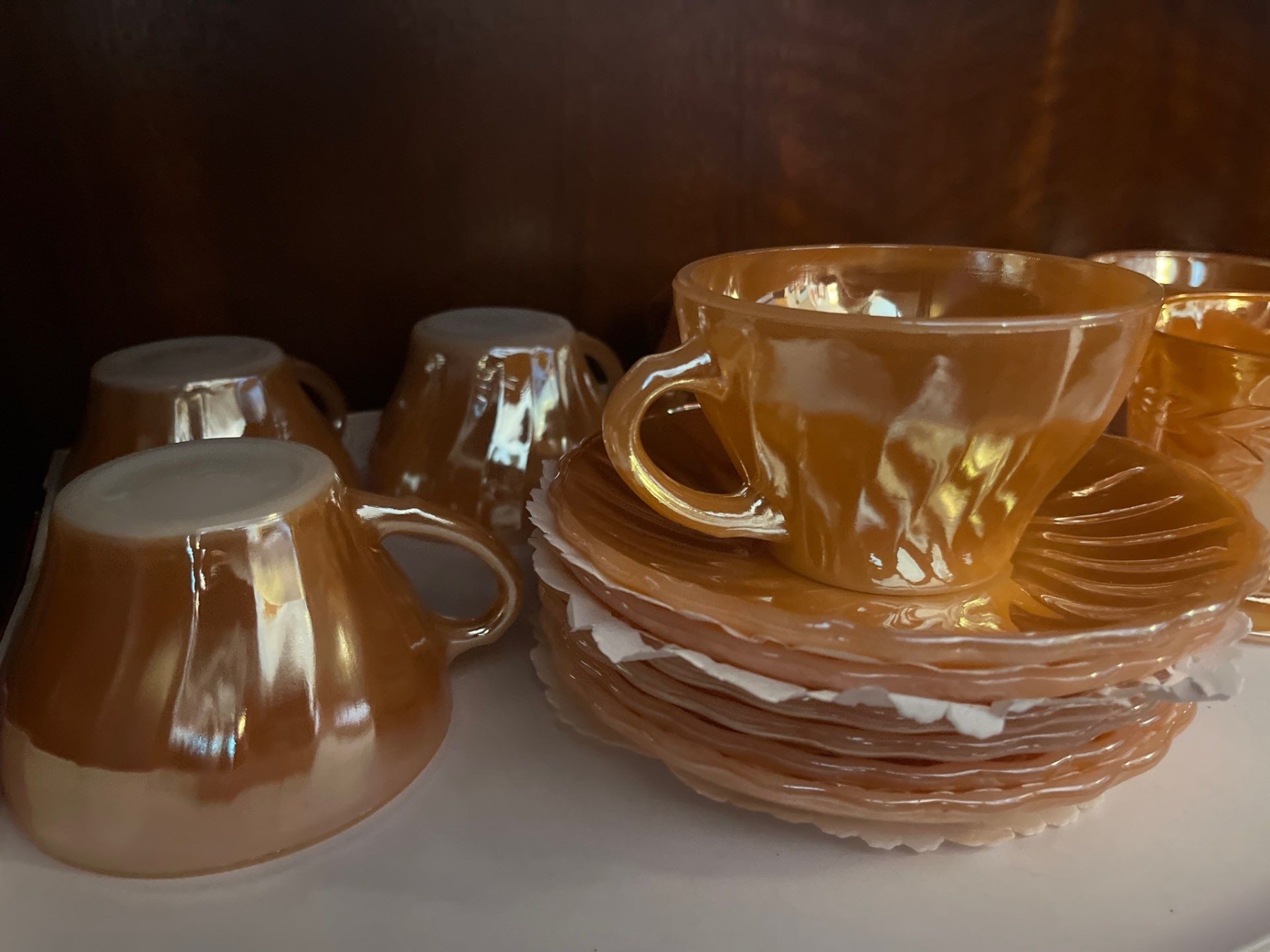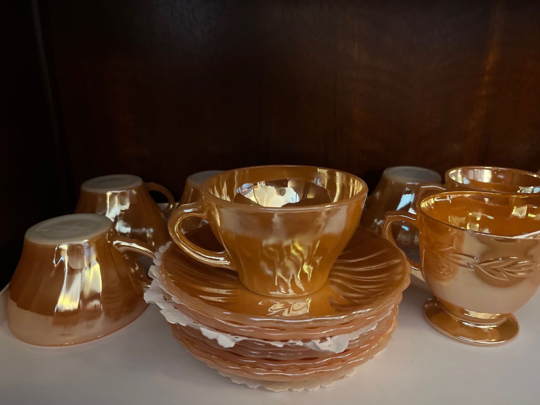 vintage Anchor Hocking Fire-King Peach Lustre 6 tea cups with matching plates and cream and sugar.