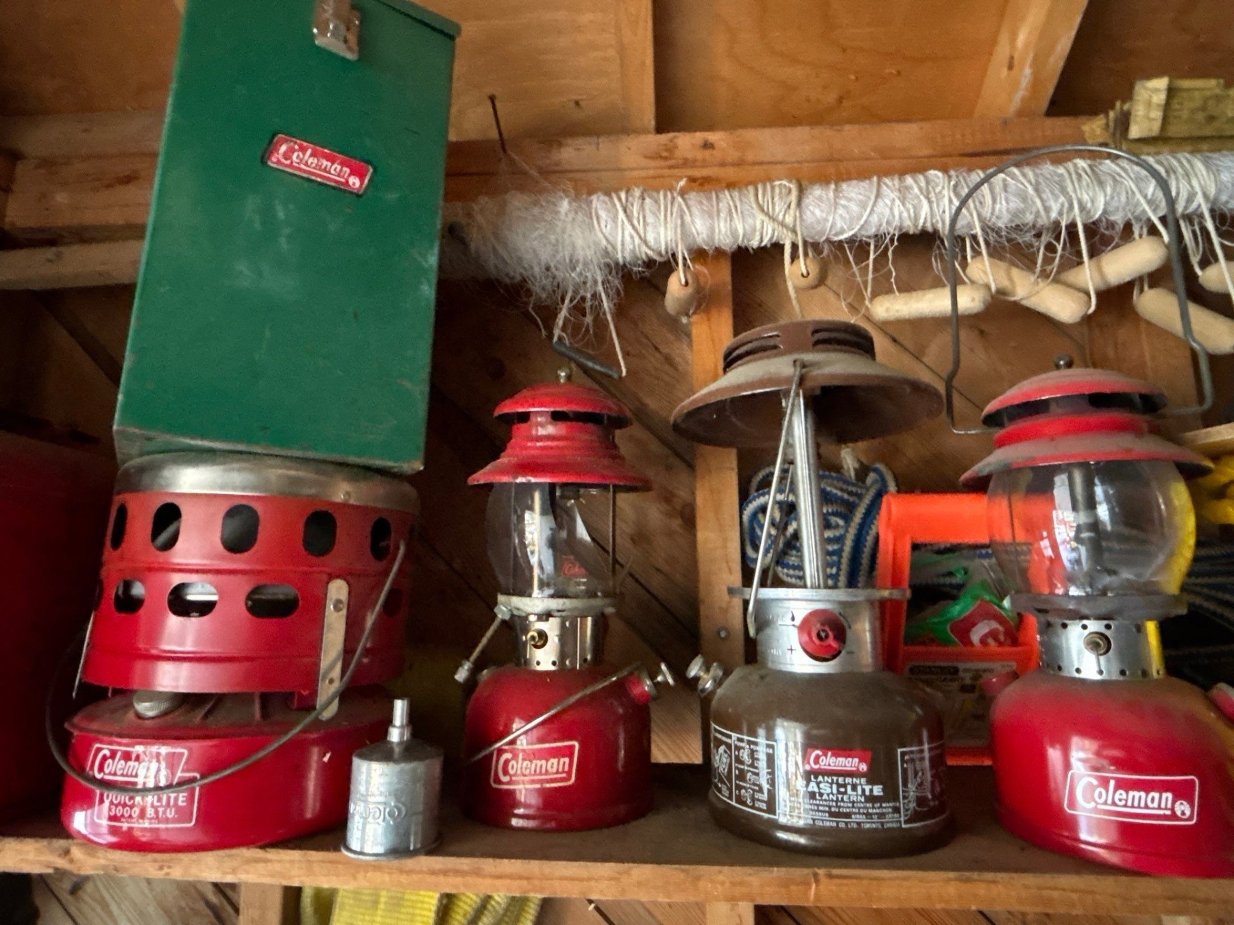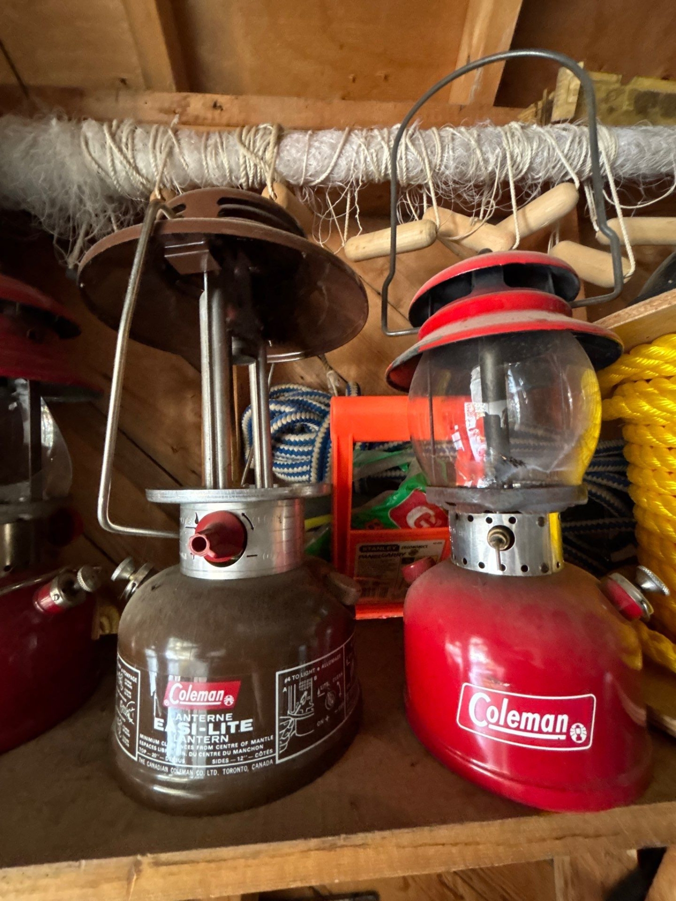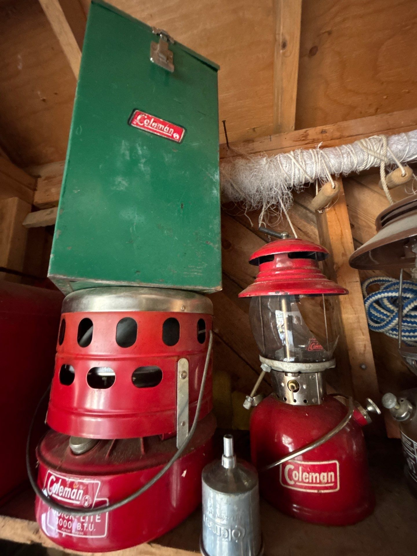 vintage Coleman lanterns and one vintage Coleman quick light 3000 BTU heater with a Coleman lantern carrying box brown lantern has no glass. One red lantern has broken glass. One red lantern has reproduction glass.