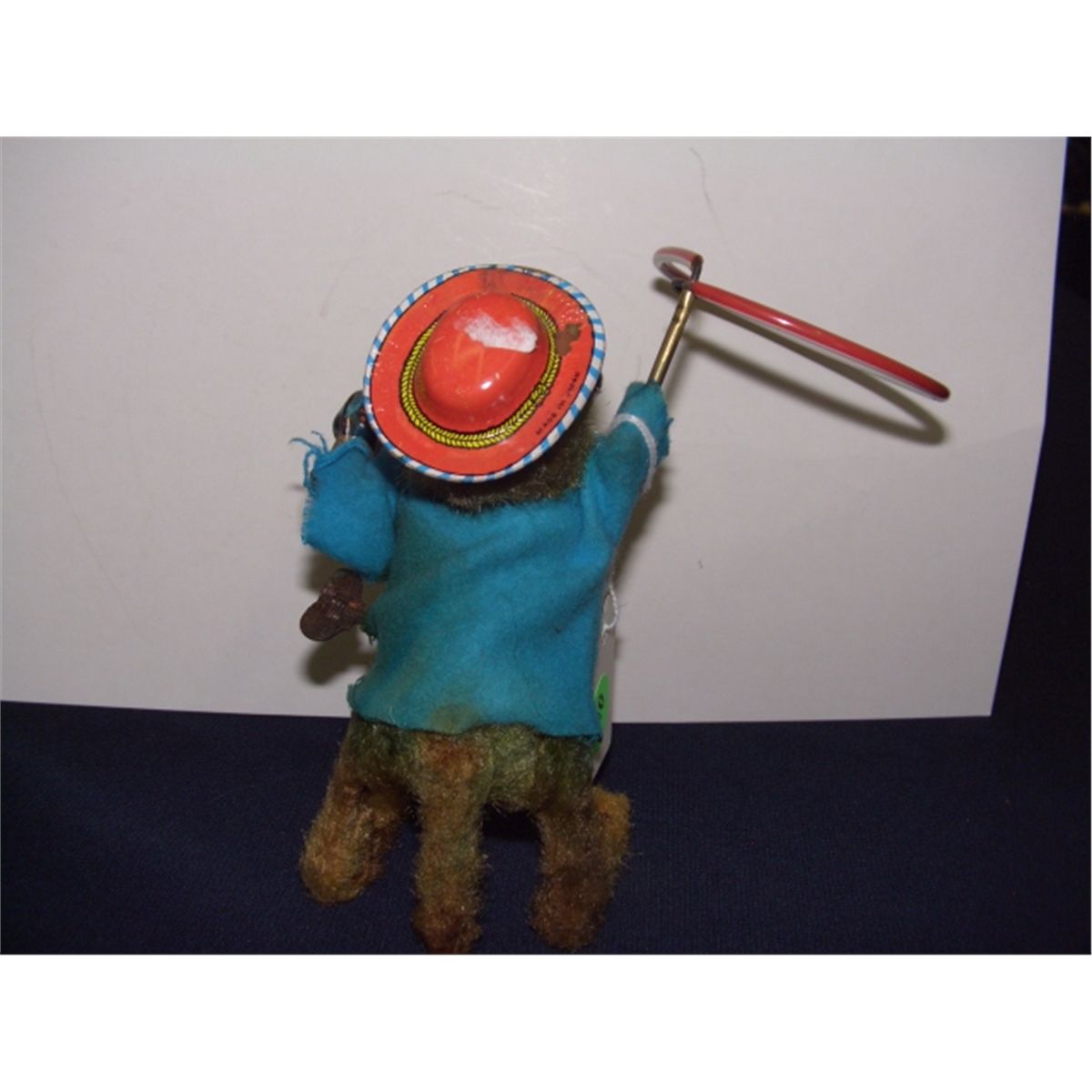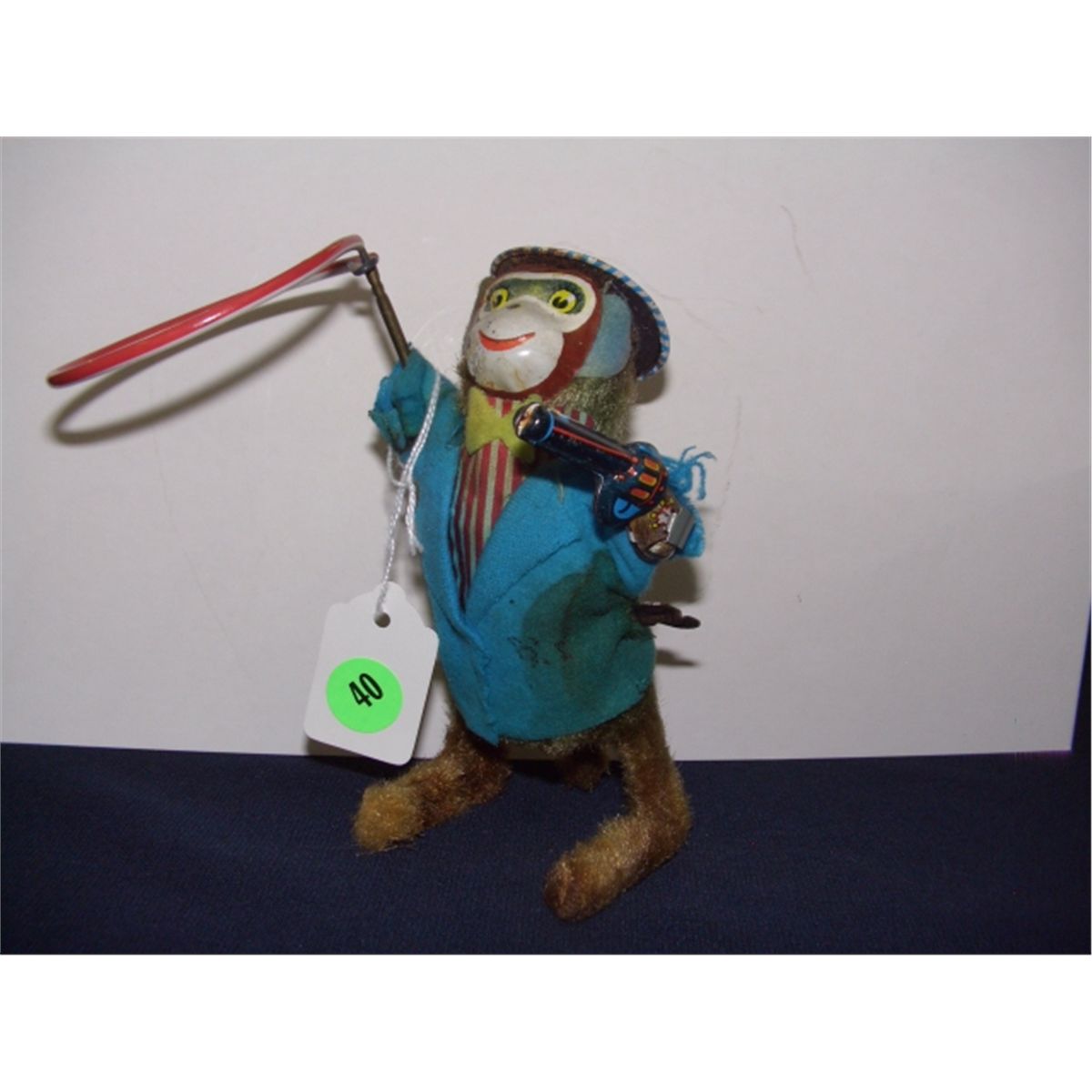 vintage Japanese tin wind up Rodeo monkey with pistol and lasso