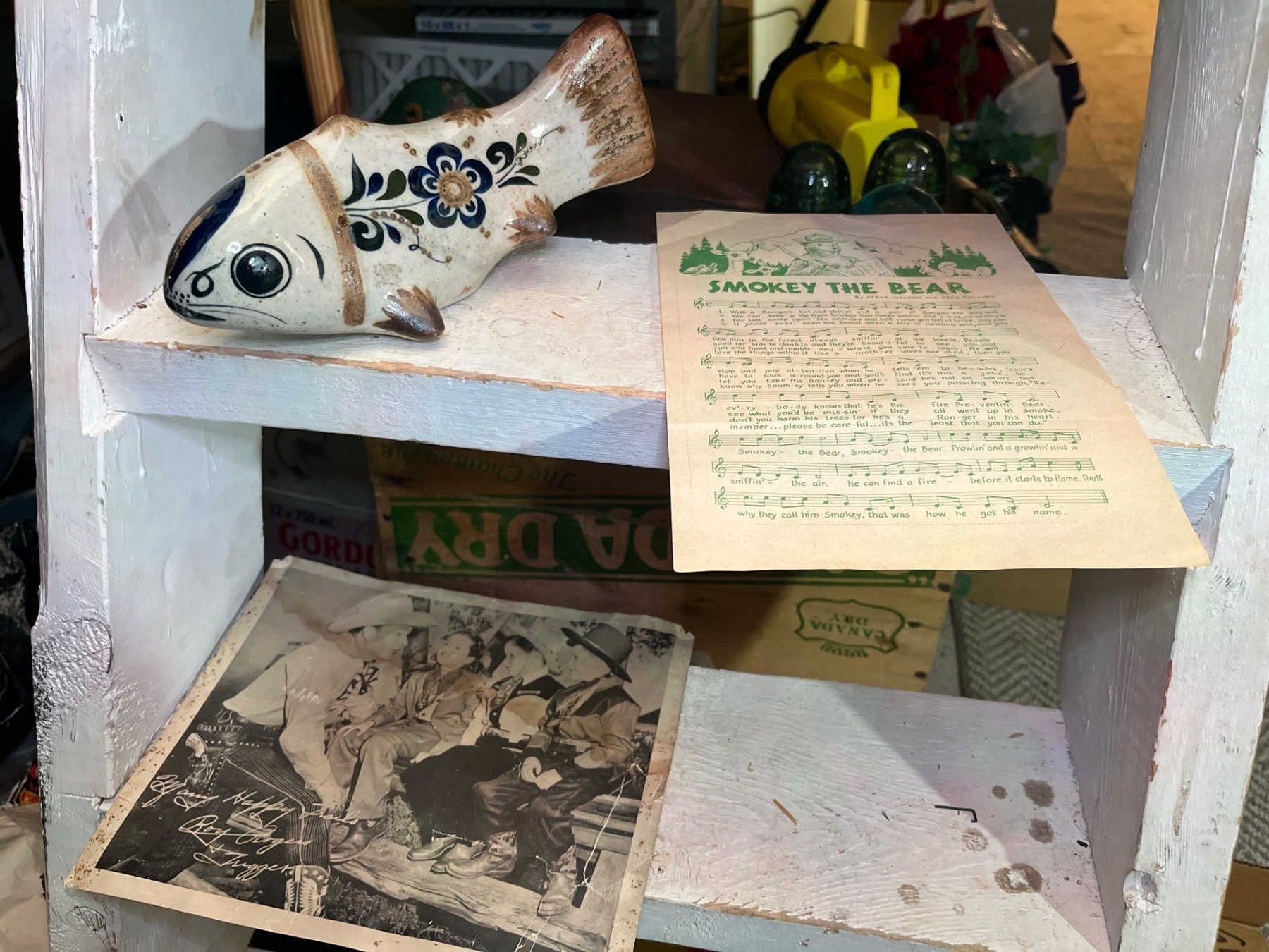 vintage Mexican Tonala folk art pottery in the shape of a fish. These items are hand-painted, glazed ceramic stoneware and an image of Roy Roger’s and Triggers