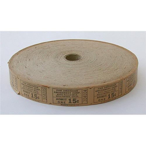 Perfect for the collector of carnival memorabilia, an entire roll of 1950s 15¢ admission tickets from the the "Pan American Amusement Corp." in Hollywood, Calif., printed by the "Dillingham Ticket Co., L.A." Roll measures 7-1/4" in diameter.