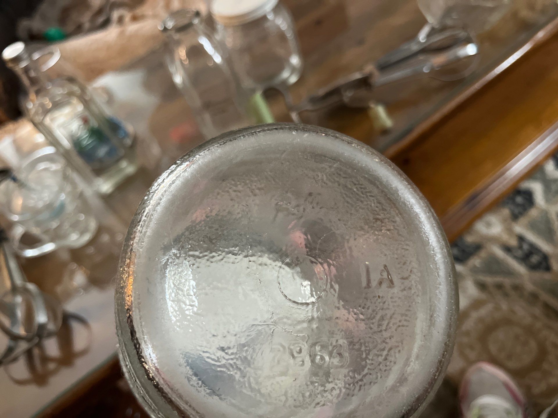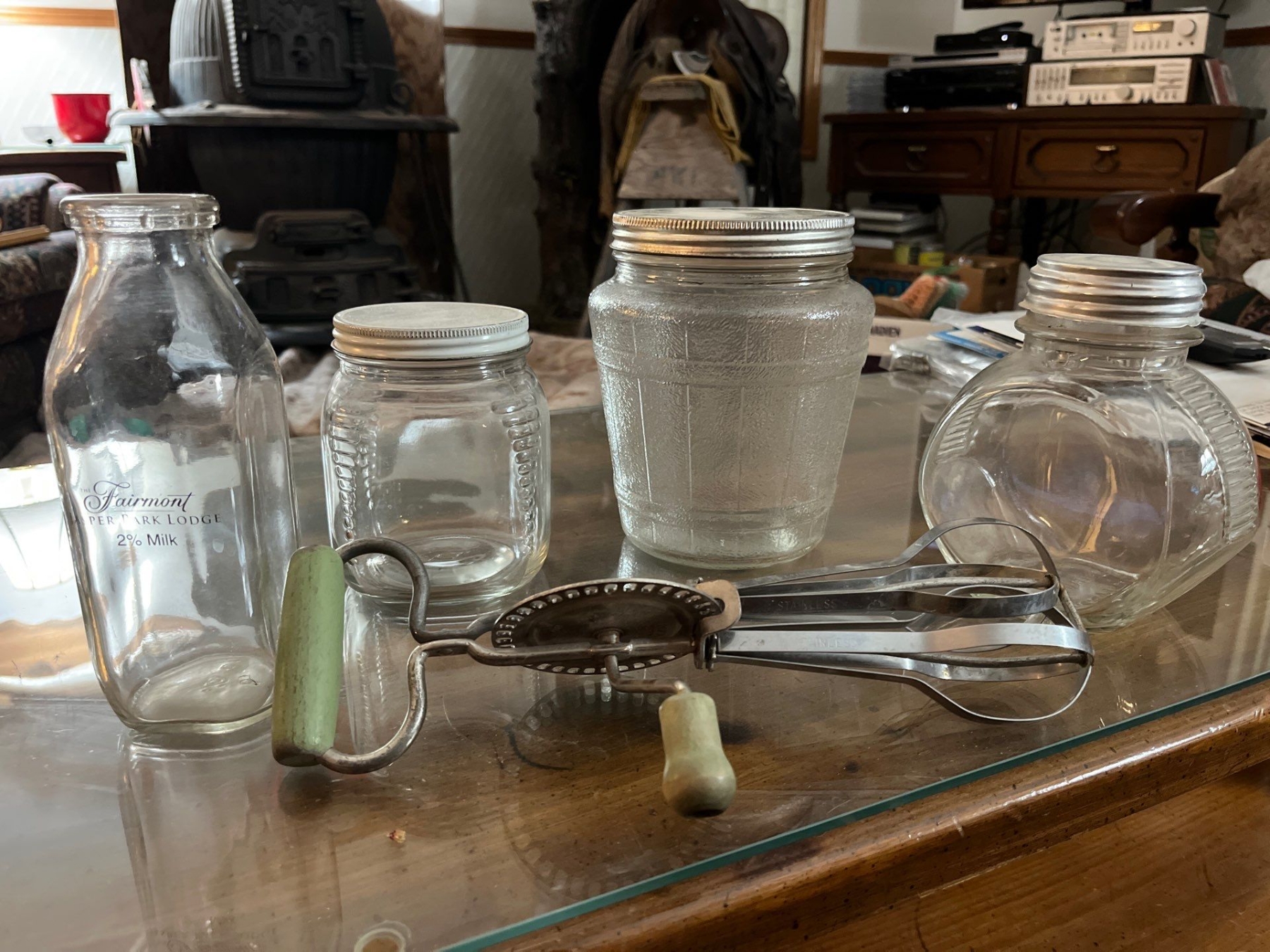 vintage Watkins bottle along with a antique hand, mixer and working condition and a vintage plastic, Mary made bottle with original yellow top