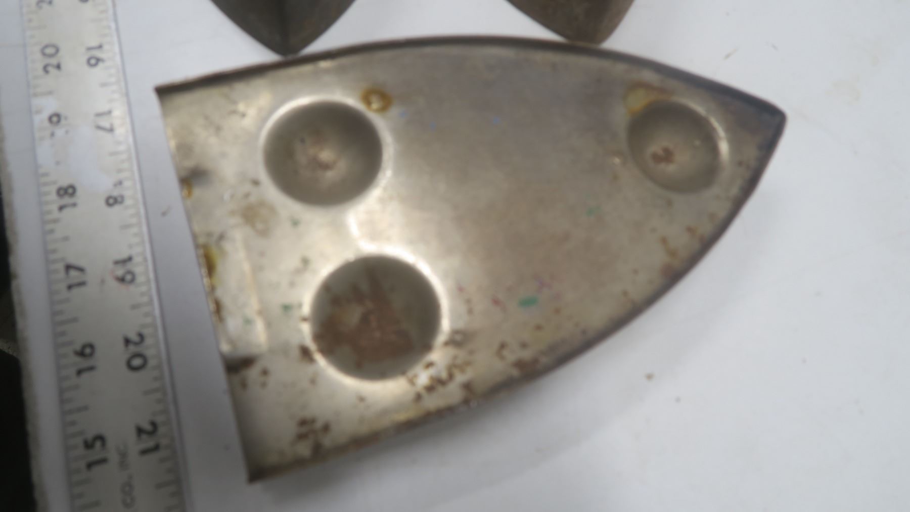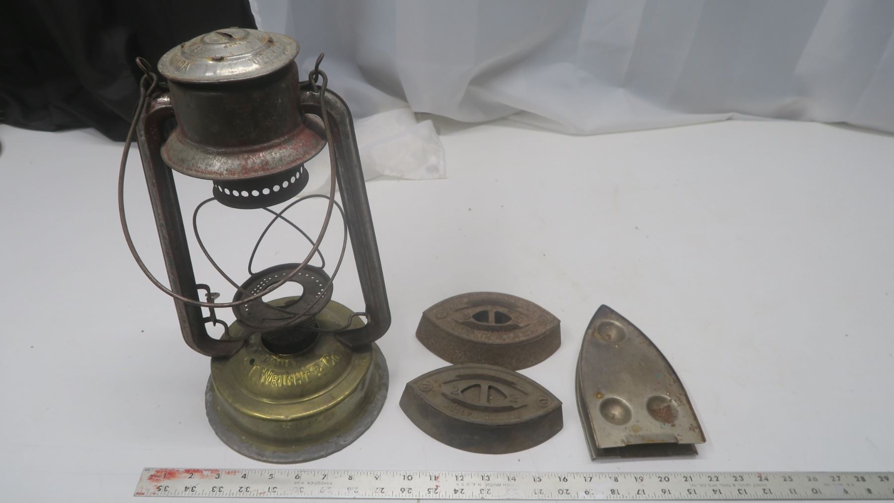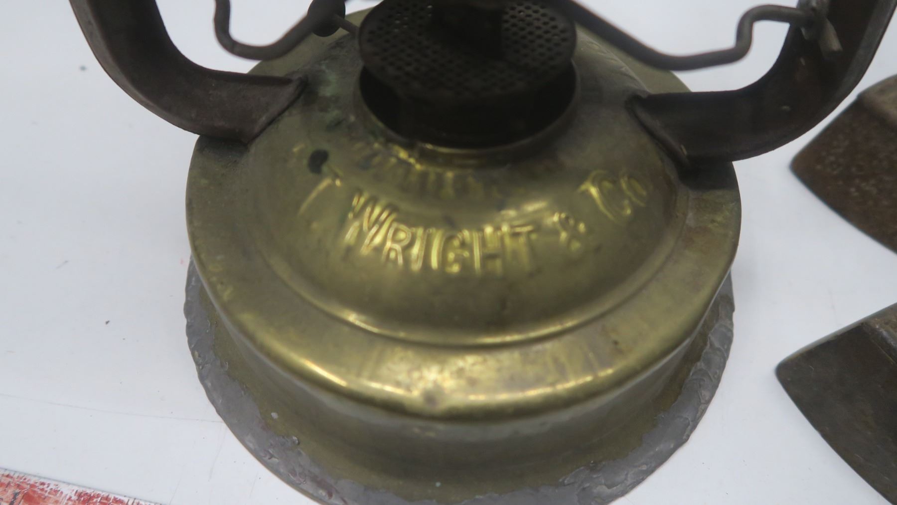 vintage Wright & Co. lamp (no globe), 2 sad irons and iron rest