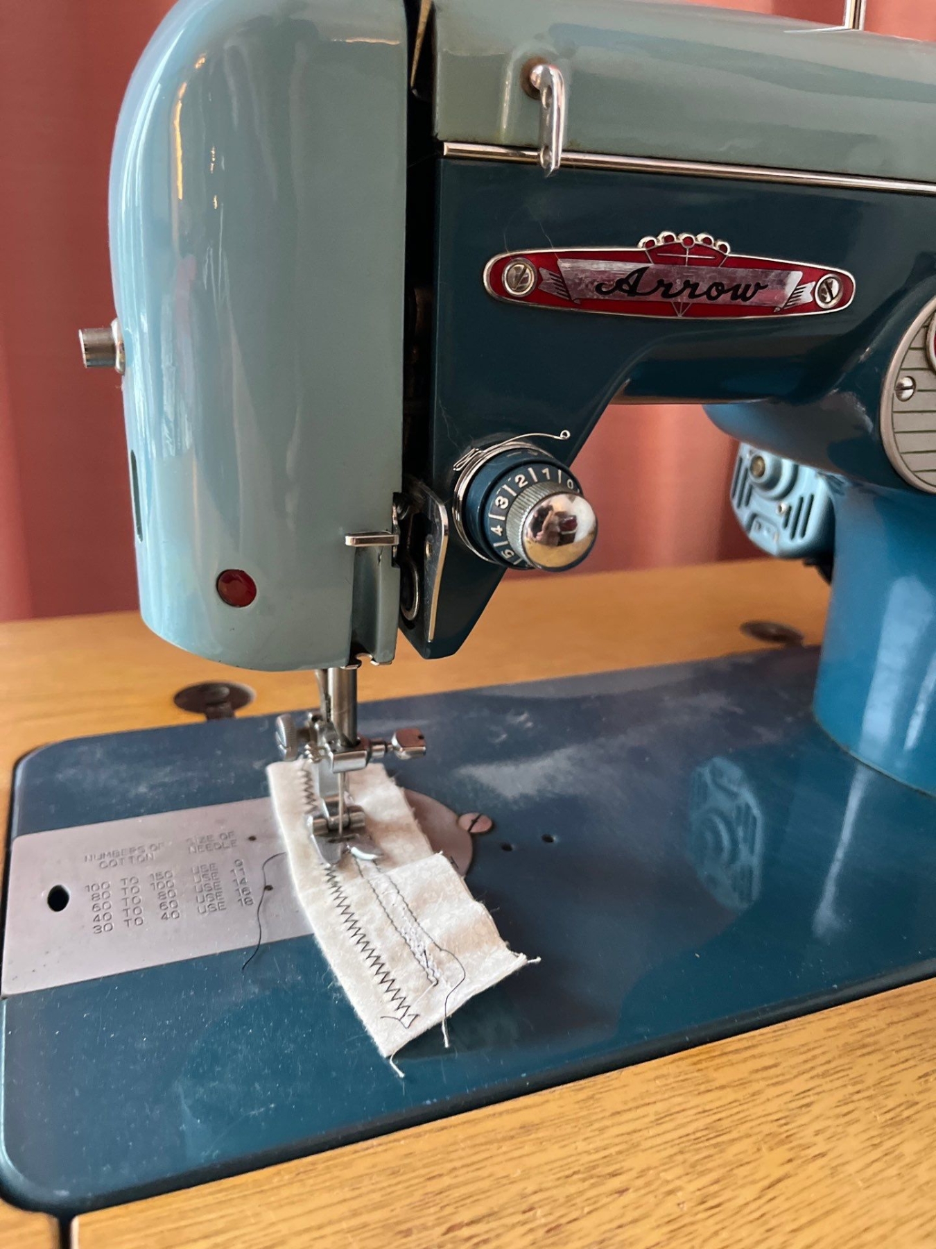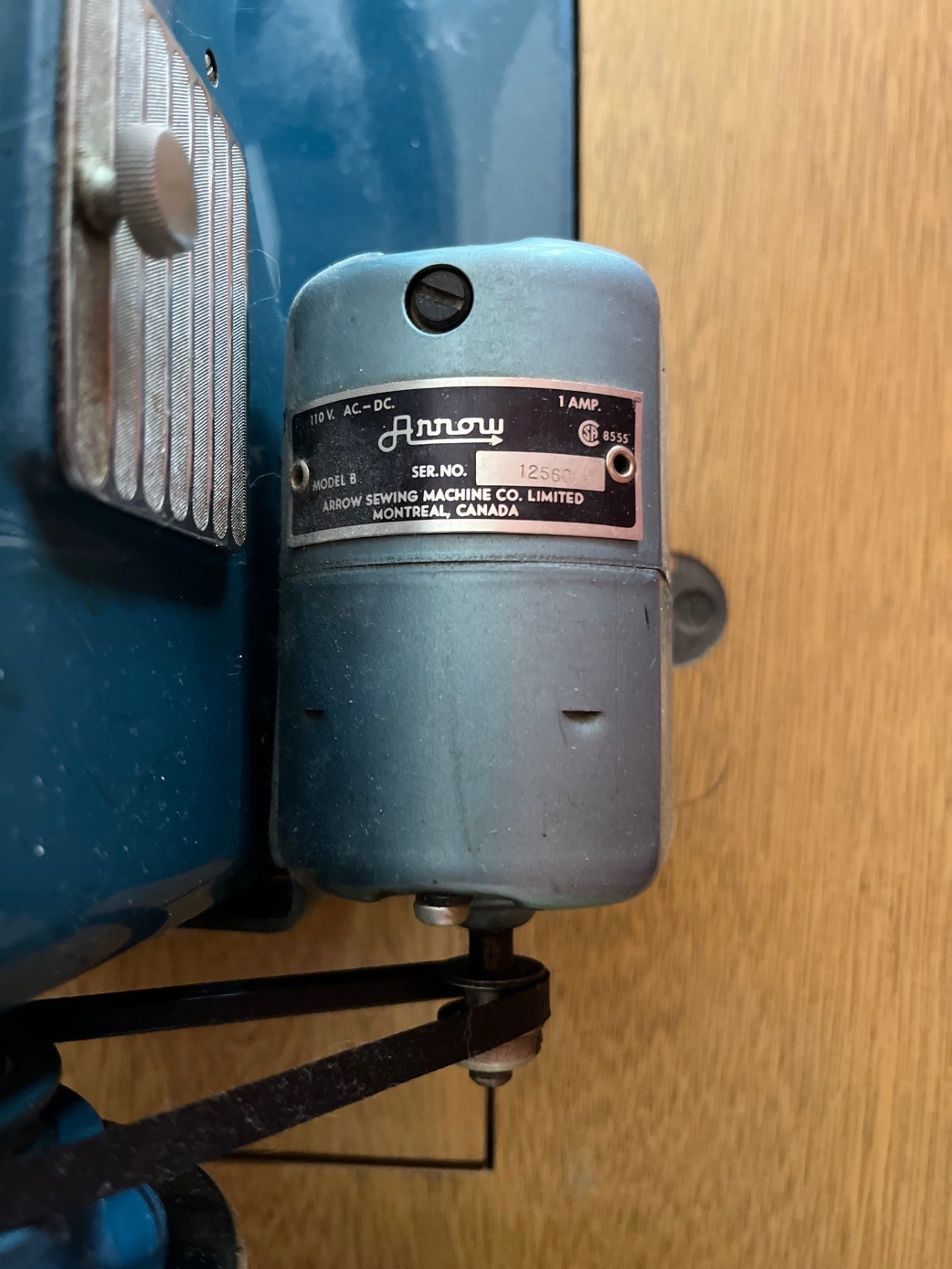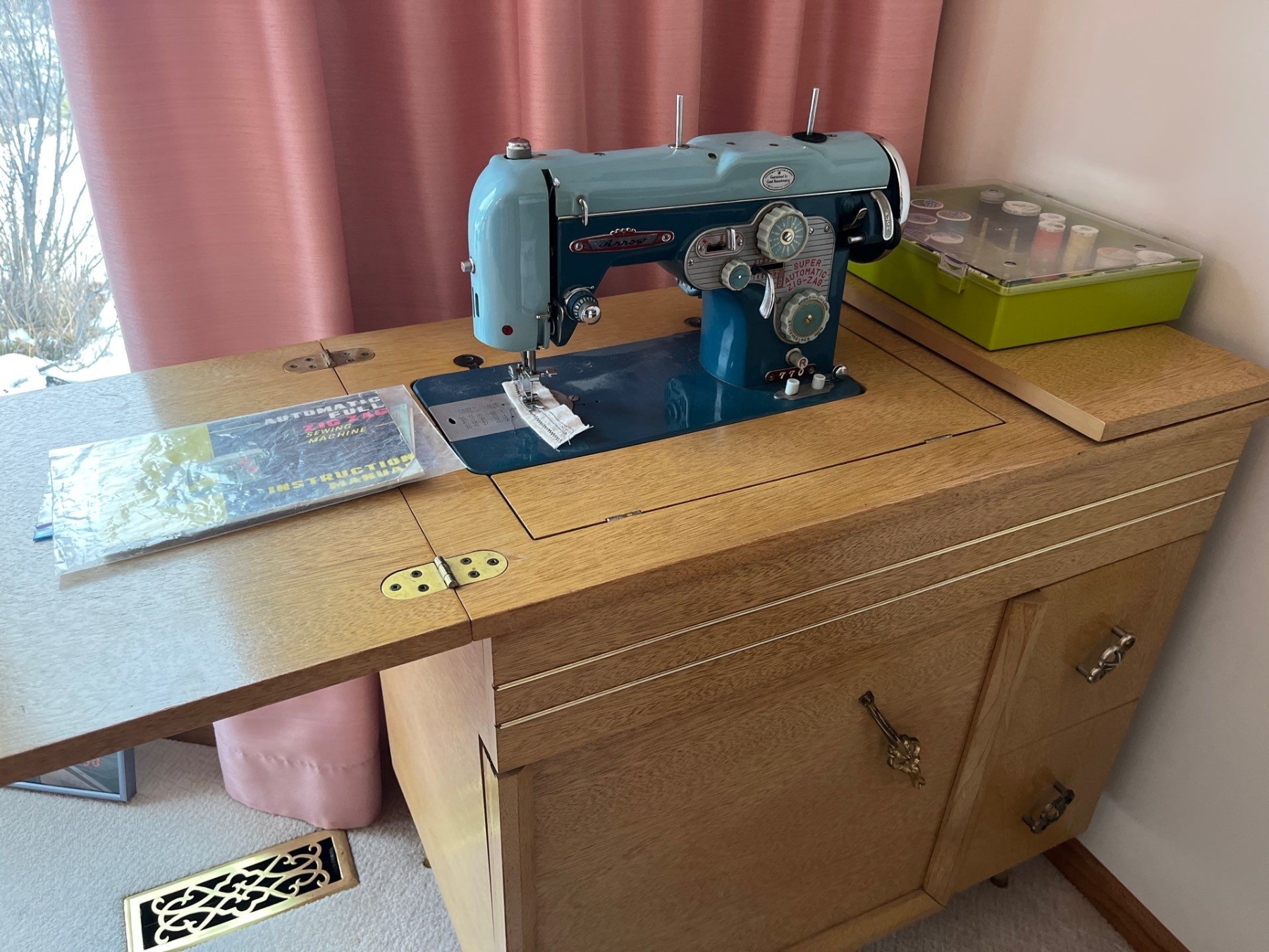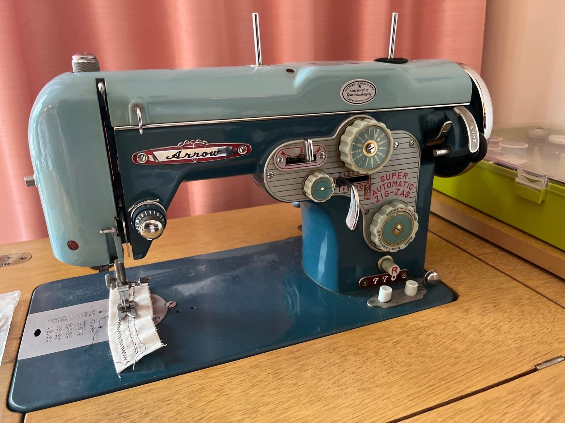 vintage arrow, super automatic, sewing machine with accessories, sewing desk and several bobbins of