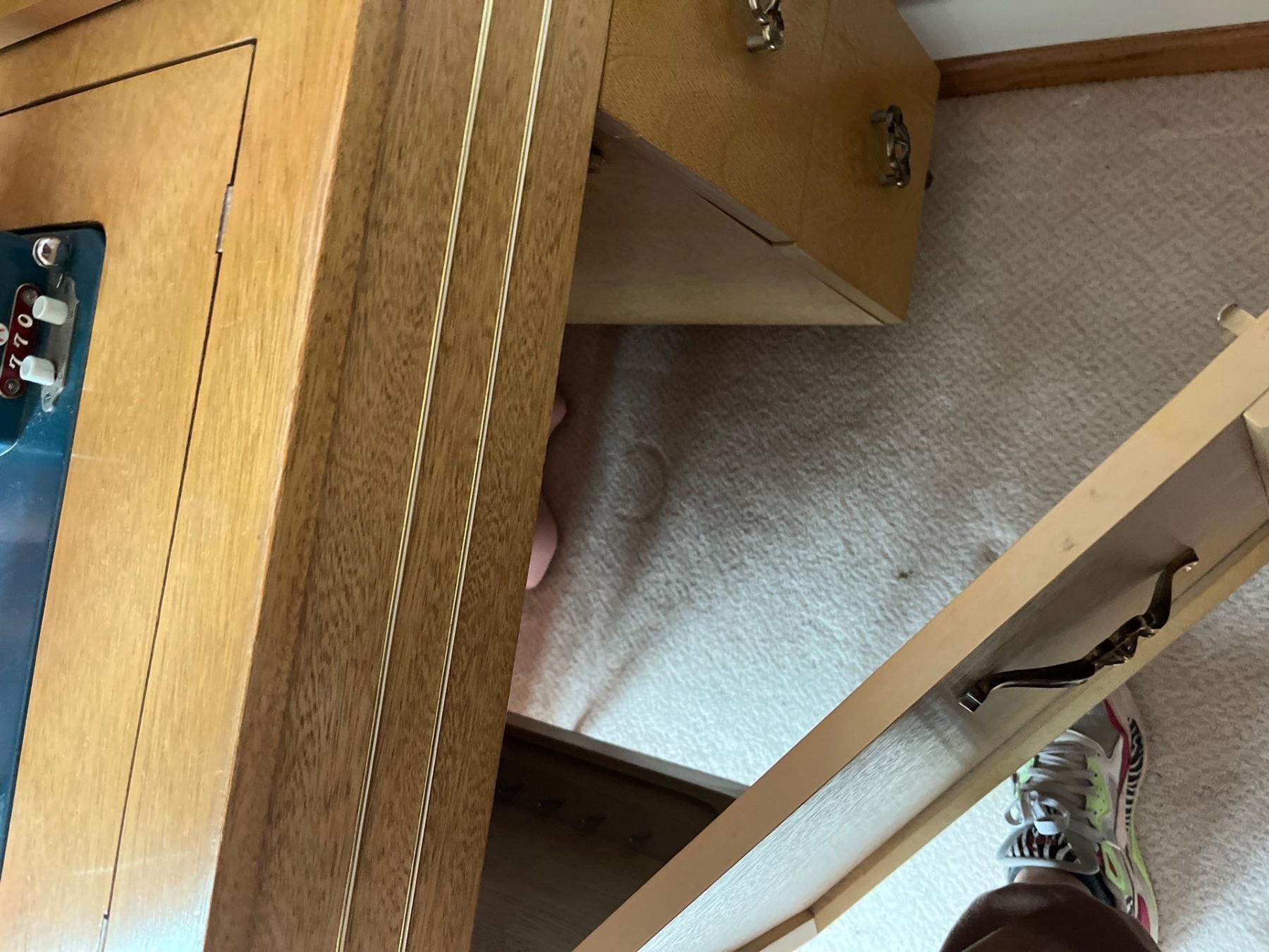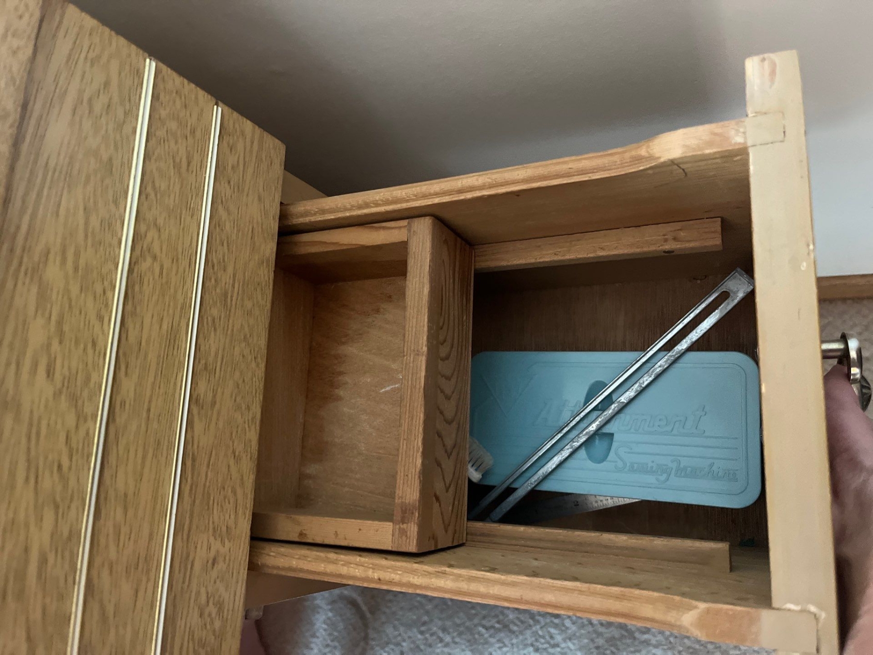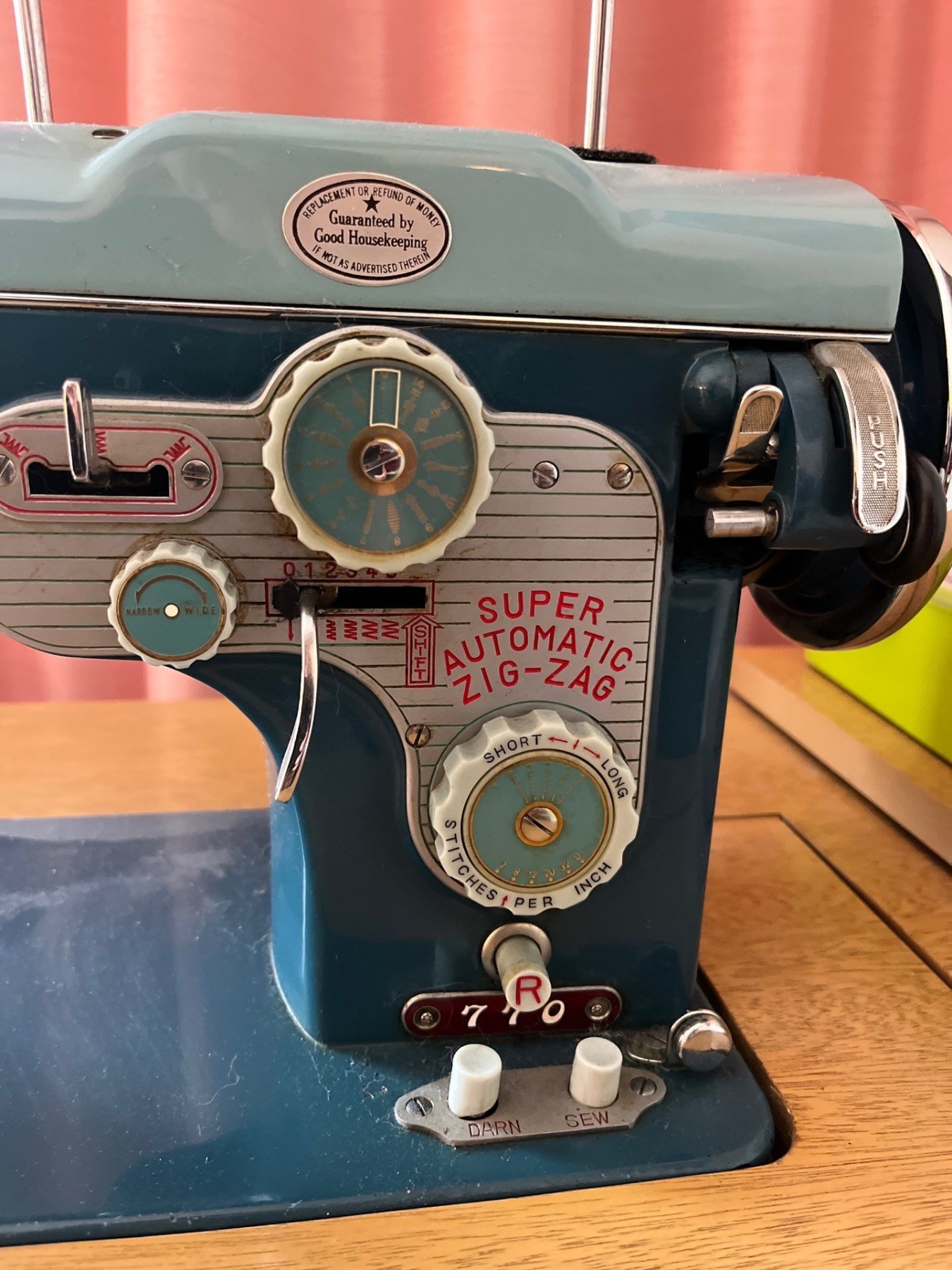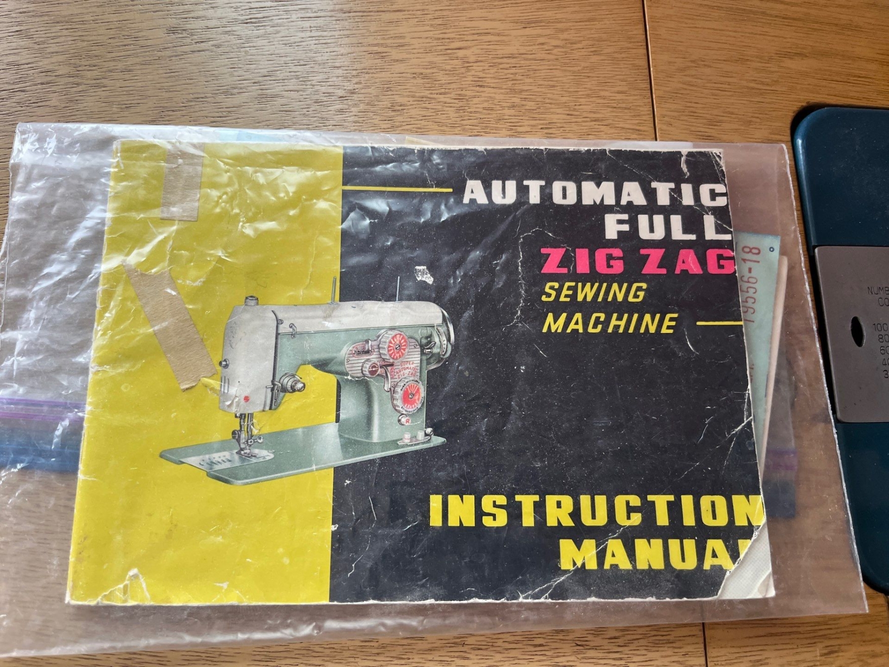 vintage arrow, super automatic, sewing machine with accessories, sewing desk and several bobbins of