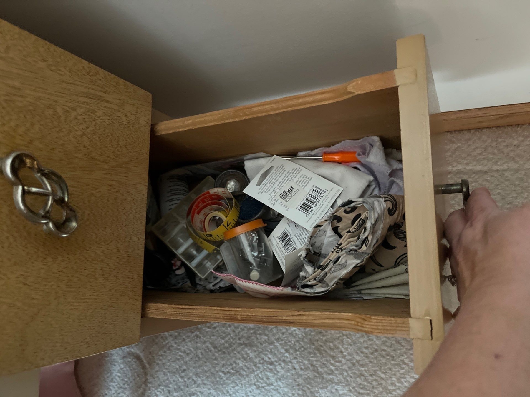 vintage arrow, super automatic, sewing machine with accessories, sewing desk and several bobbins of thread .